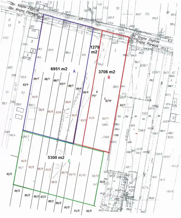 For sale: a complex of plots with a total area of 2,300 m², located in Krajno Pierwsze, Górno commune. Access via a dirt road of approx. 50 m. The property is situated in the second line from the asphalt county road.