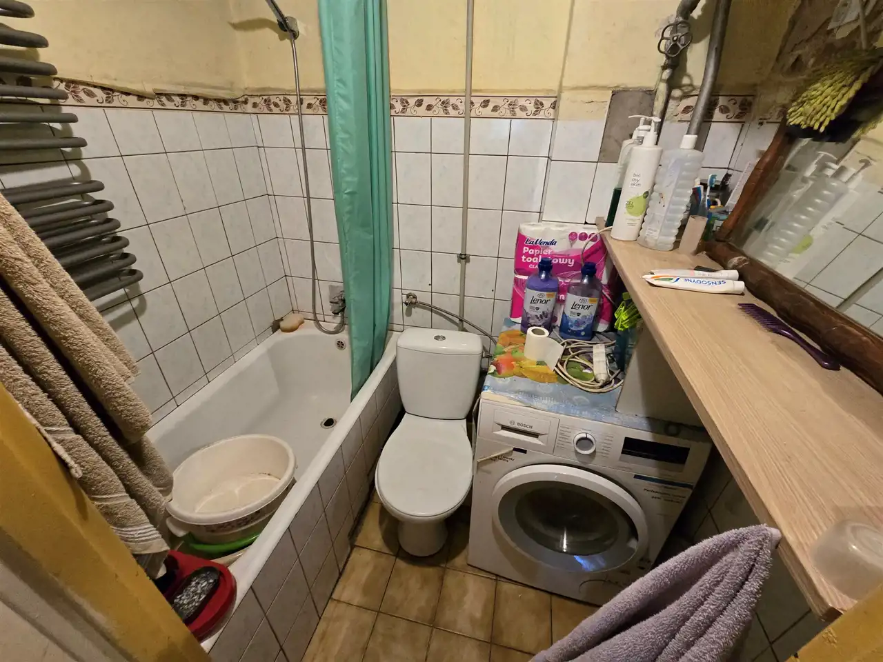 Ogrzewany piecem ( piec zlokalizowany w kuchni), ciepła woda w bojlera.