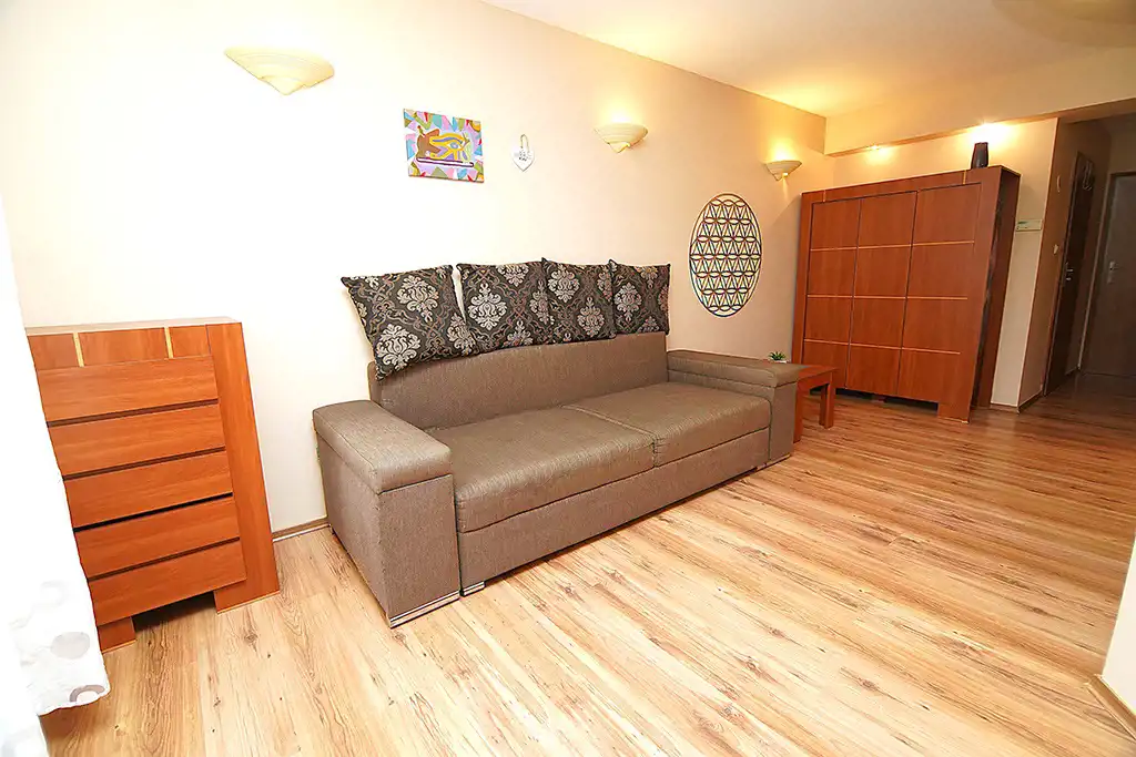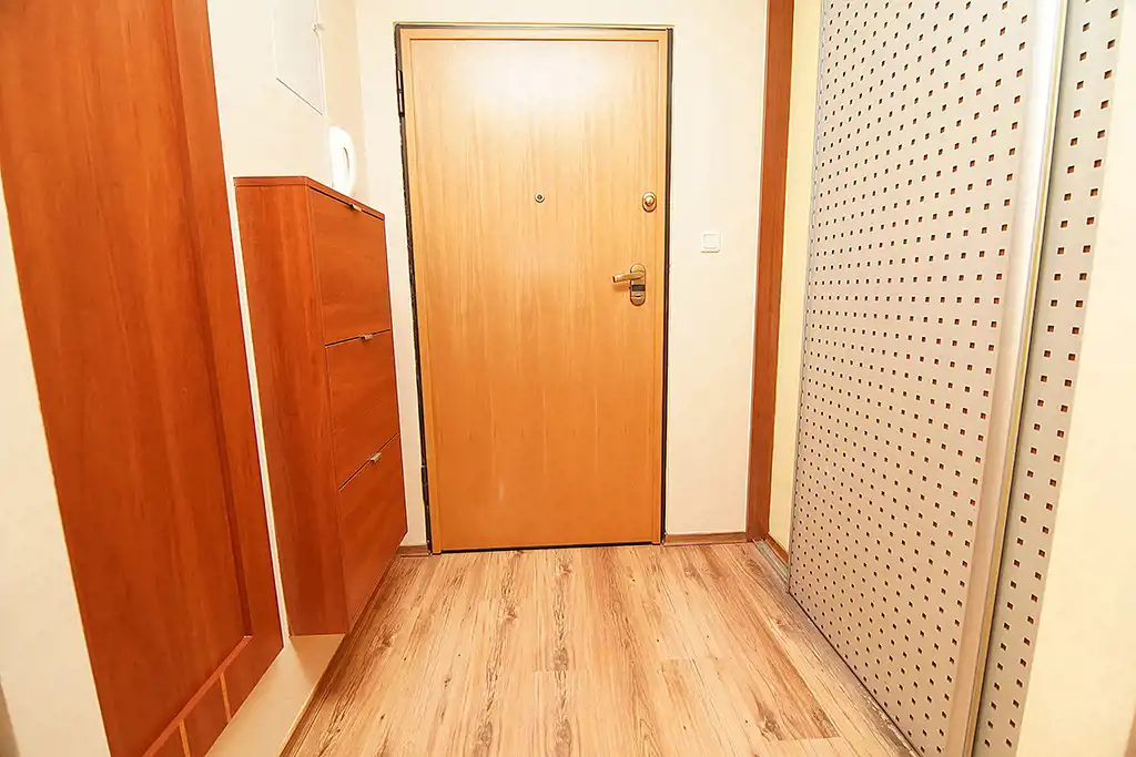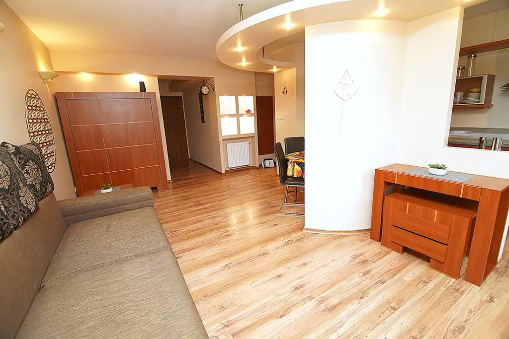 Nieruchomość sprzedawana jest z pełnym wyposażeniem – wszystkie meble widoczne na zdjęciach pozostają w mieszkaniu, co czyni je gotowym do zamieszkania od zaraz.