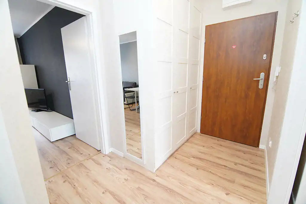 W skład mieszkania wchodzą: 2 pokoje, kuchnia, łazienka z WC i przedpokój.