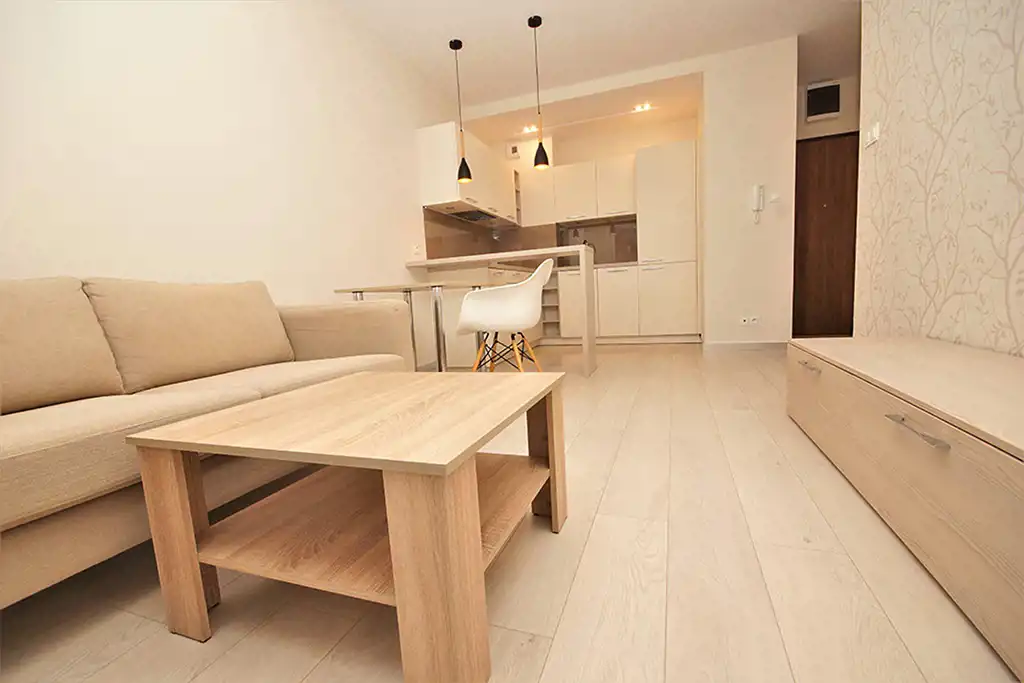 Mieszkanie składa się: z kuchni połączonej z salonem, sypialni, łazienki z WC oraz przedpokoju. Wyraźnym atutem mieszkania jest duży balkon.