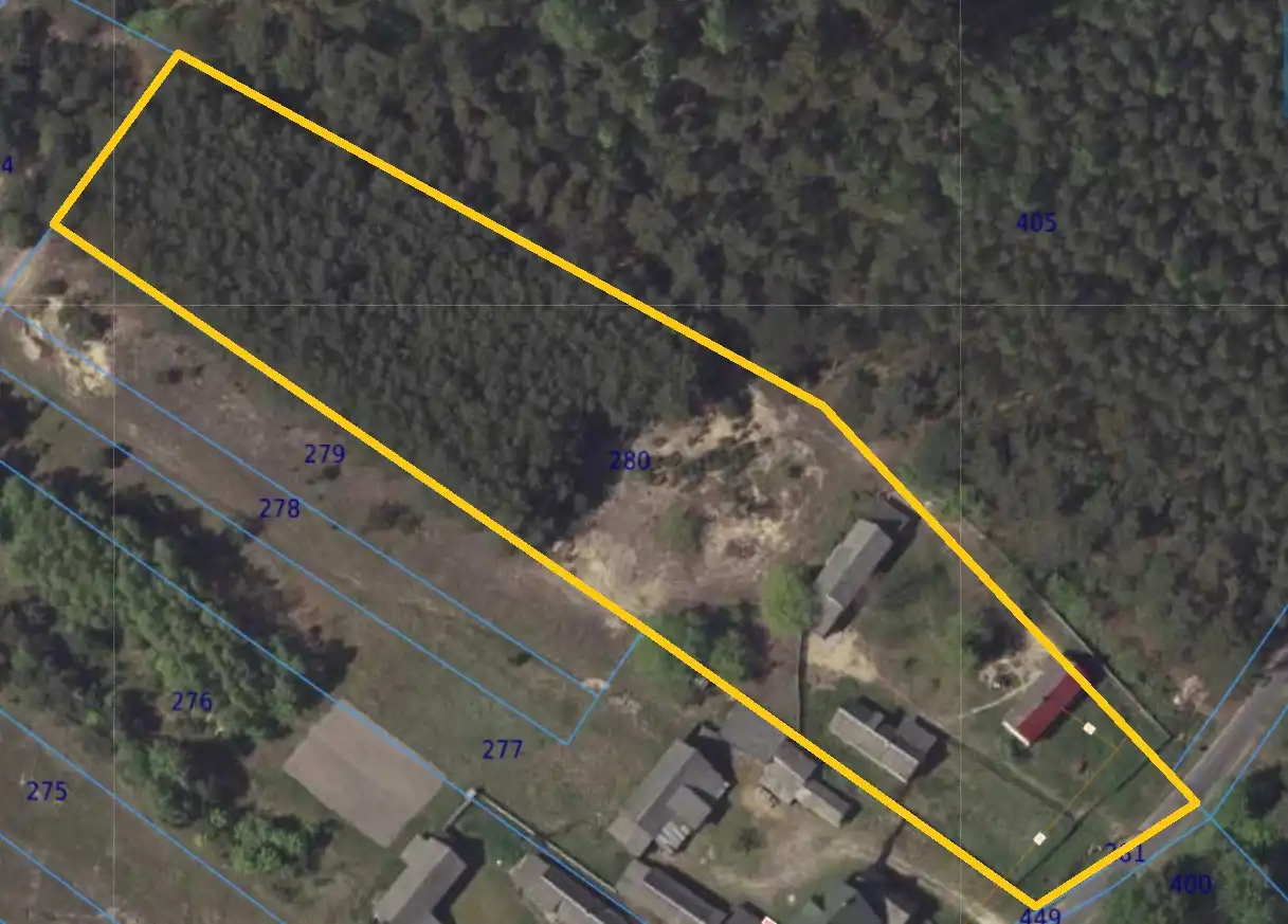 Część siedliskowa działki została odgrodzona, znajduje się na niej parterowy budynek mieszkalny o powierzchni zabudowy ok 70 m², murowano-drewniana stodoła o powierzchni zabudowy ok 130 m² oraz murowany budynek gospodarczy o powierzchni zabudowy ok. 100 m². Na nieogrodzonej części działki znajdują się zadrzewienia, w ewidencji oznaczone jako RVI.