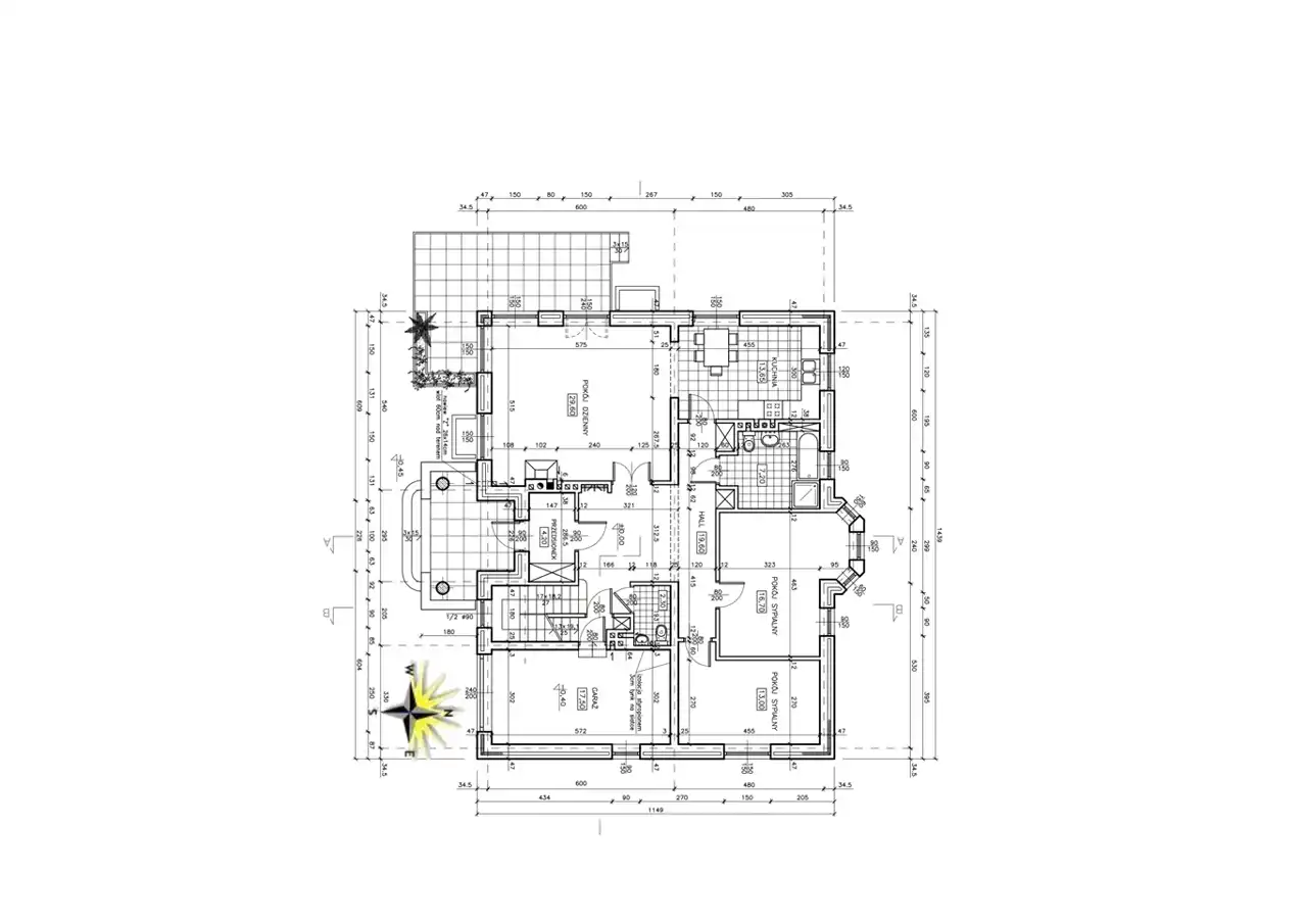 dwie sypialnie, łazienka, wc z pralnią, hall, garaż jednostanowiskowy.