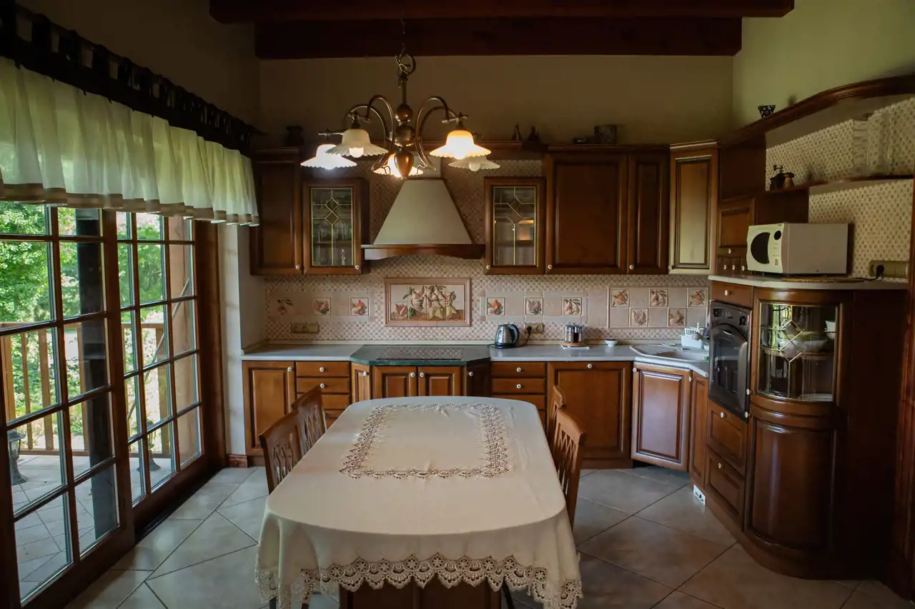 - Kuchnia - serce domu . To przestrzeń, która spełnia marzenia każdej gospodyni. Znajduje się tu wszystko, co potrzebne do codziennych i odświętnych posiłków, a przyległa spiżarnia pozwala na wygodne przechowywanie zapasów. W centralnym miejscu stoi duży stół, przy którym może usiąść liczna rodzina i grono przyjaciół, by wspólnie spędzać czas. Całość dopełnia piękny widok z okna, sprawiający, że nawet codzienne chwile nabierają wyjątkowego charakteru.