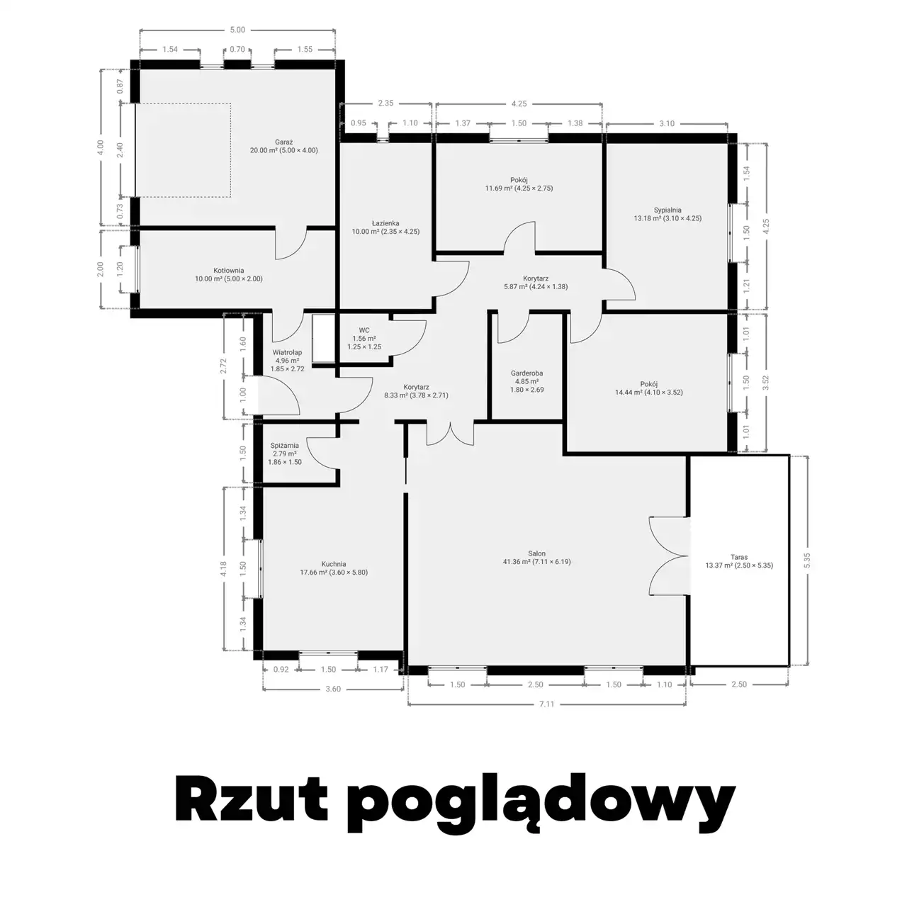 Wiatrołap, hol, kuchnia, spiżarnia, salon + aneks jadalniany z wyjściem na taras, garderoba, 3 sypialnie, łazienka, WC, kotłownia, garaż.