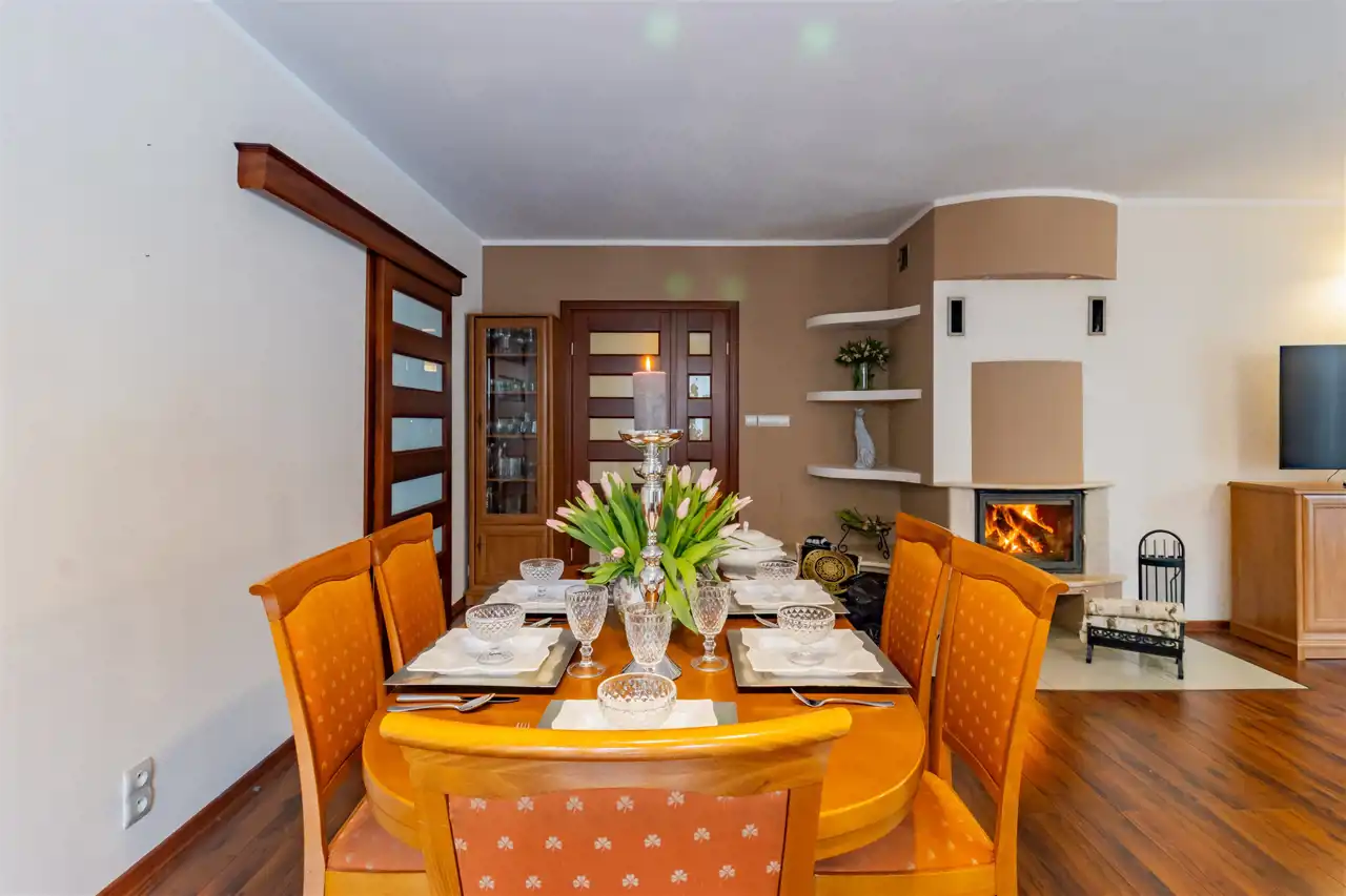 - Przestronny salon połączony z aneksem jadalnianym oraz wyjściem na taras tworzy reprezentacyjną, otwartą strefę dzienną, idealną do codziennego życia i spotkań z bliskimi. Duże okno tarasowe zapewnia doskonałe doświetlenie wnętrza oraz piękny widok na zieleń, wprowadzając do domu naturalne światło i harmonię z otoczeniem. Centralnym punktem tej przestrzeni jest klimatyczny kominek, który nadaje całości elegancji i przytulnego, ciepłego charakteru.