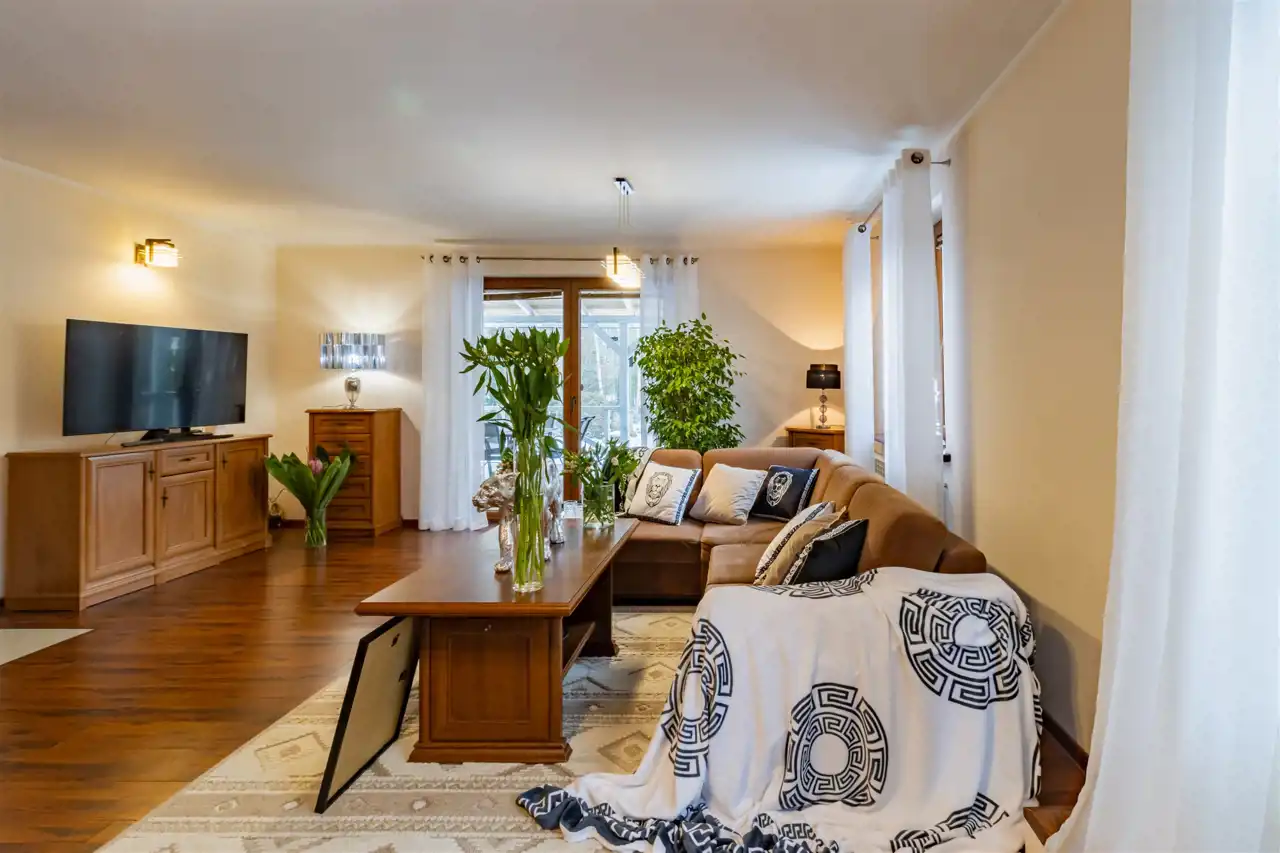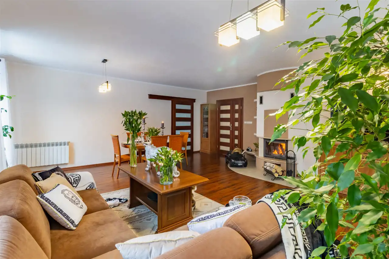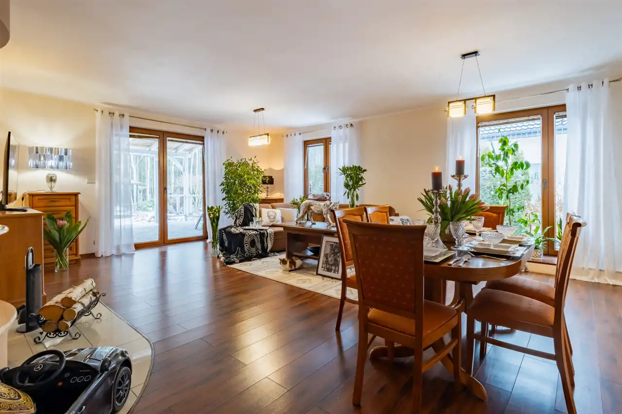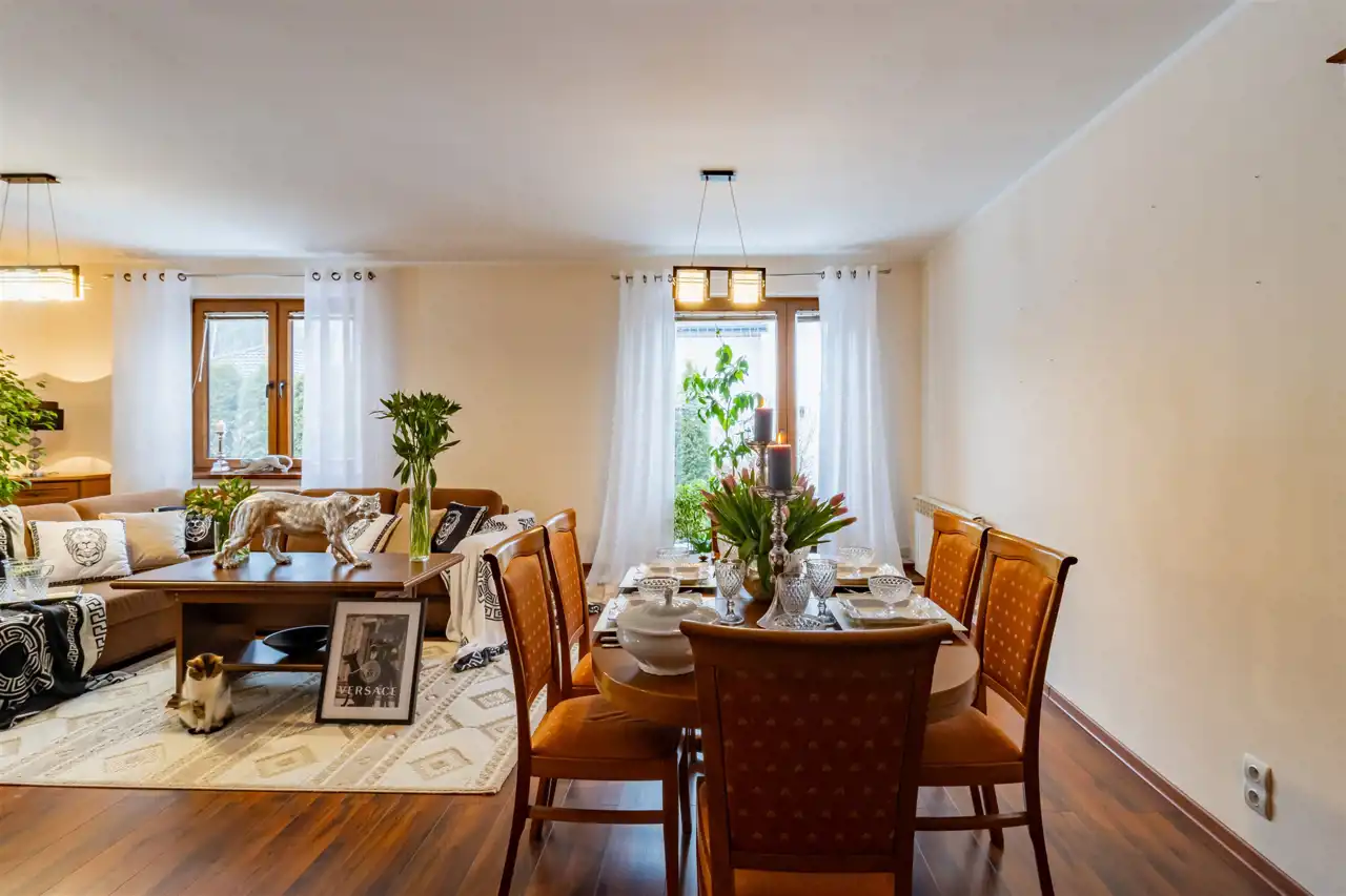 - Cały dom spaja piękny, duży ogród, który stanowi prawdziwe serce nieruchomości, harmonijnie komponując się z jej eleganckim wnętrzem.