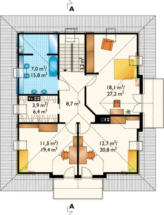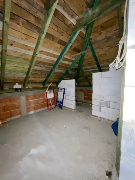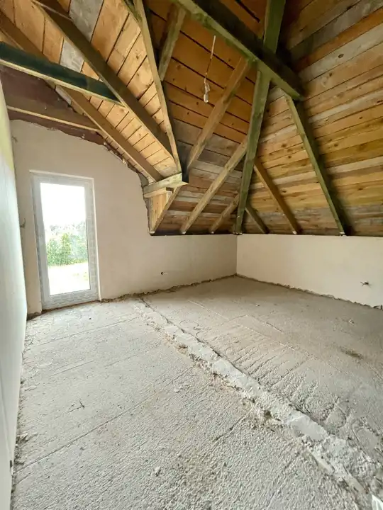 Wygodna klatka schodowa prowadzi na poddasze do trzech sypialni. Jest do przestrzeni z dużą łazienką, połączoną z pralnią oraz z garderobą.