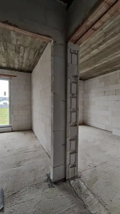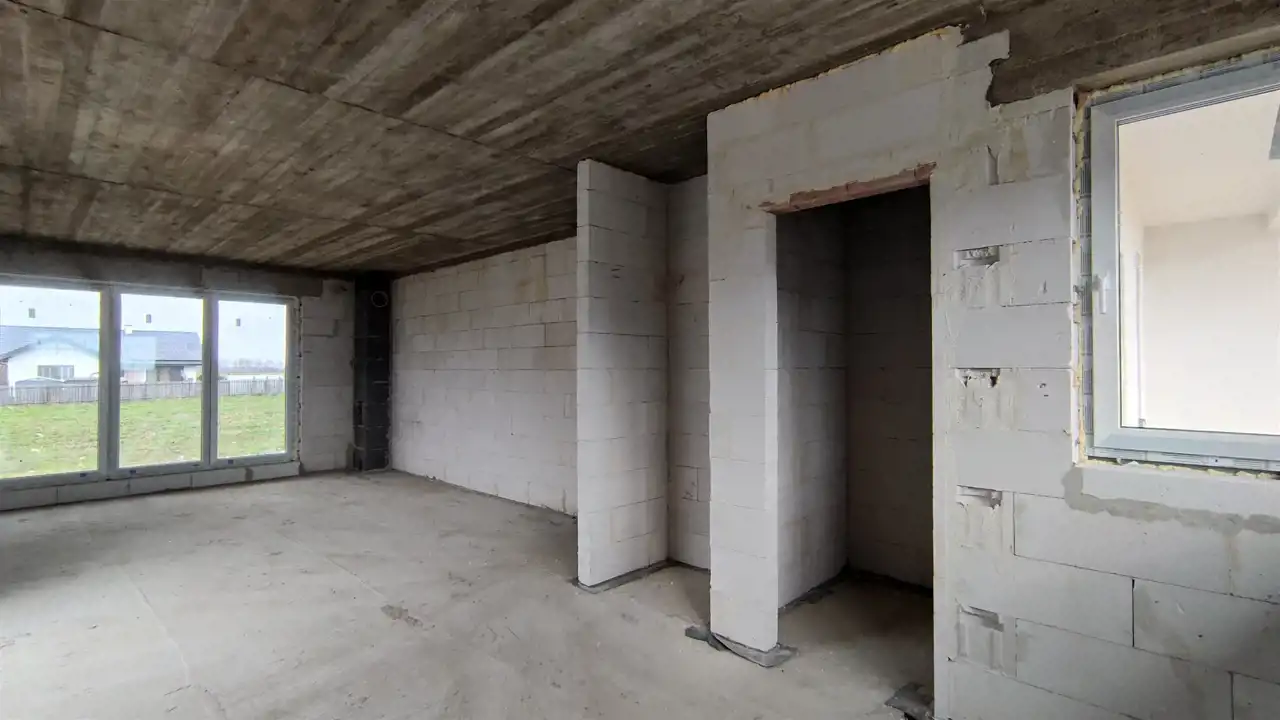 Konstrukcja z lanym stropem, ściany z gazobetonu docieplone styropianem, dach przykryty membraną i blachodachówką, okna 3 szybowe. Do budynku podłączone szambo, wodociąg w drodze wewnętrznej, umowa podpisana na skrzynki elektryczne.