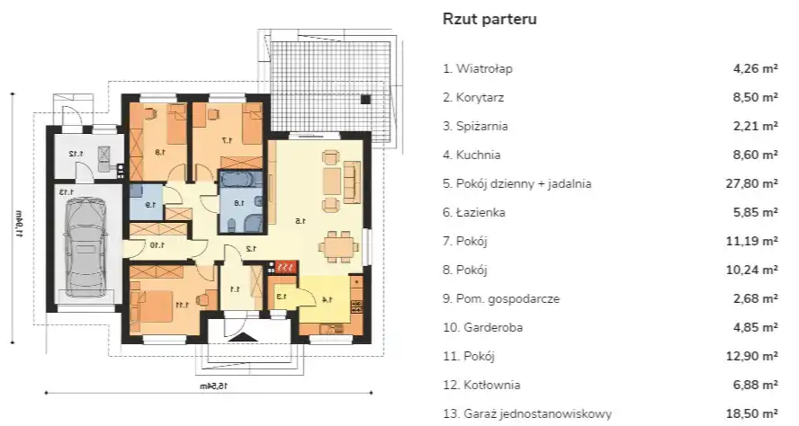 Na 124,46 mkw powierzchni użytkowej znajdują się 3 sypialnie, salon, łazienka, kuchnia, garderoby, kotłownia.