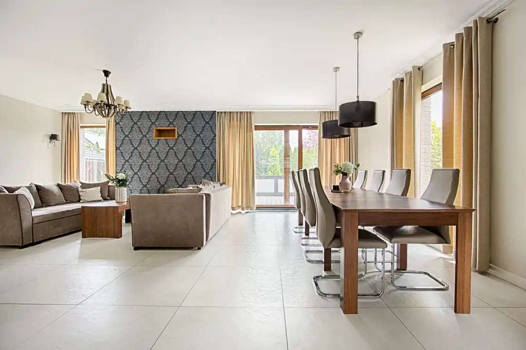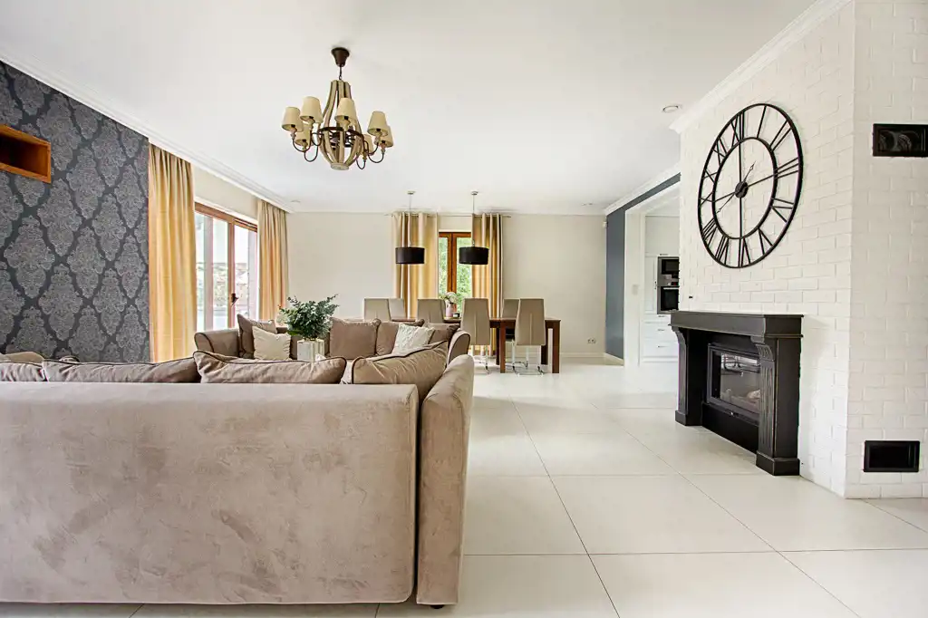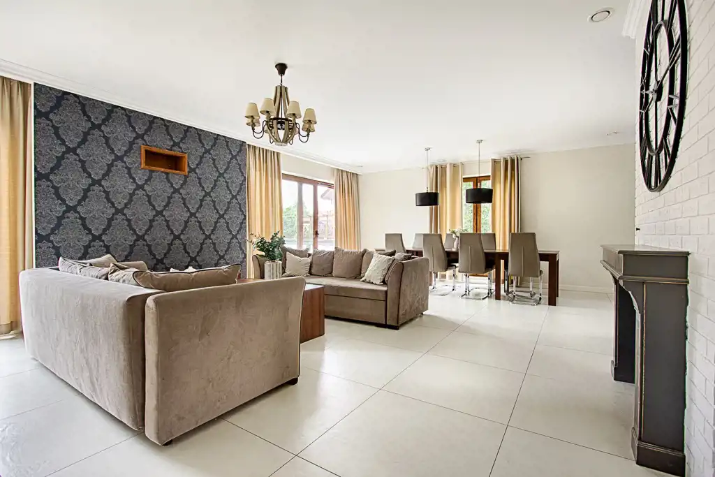 - salon z kominkiem połączony z jadalnią i wyjściem na taras