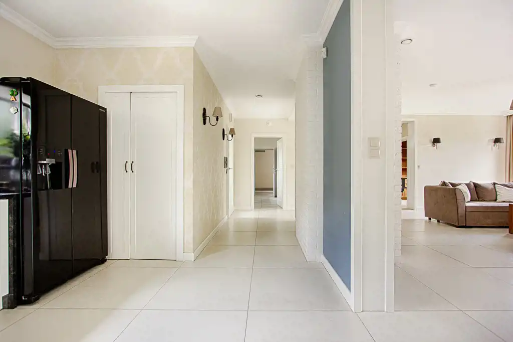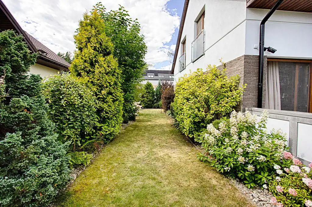 Wnętrza wykończone w wysokim standardzie i funkcjonalnym stylu. Na podłogach gres oraz drewniane deski, schody wykonane przez stolarza również drewniane, kamienne parapety, okna wyposażone w moskitiery, rekuperacja. Kompleksowa instalacja ogrzewania podłogowego na dwóch kondygnacjach, automatyczny system nawadniania ogrodu, gruntowa pompa ciepła, tradycyjny kominek z miejscowym rozprowadzeniem ciepła, system alarmowy z zewnętrznym monitoringiem.
