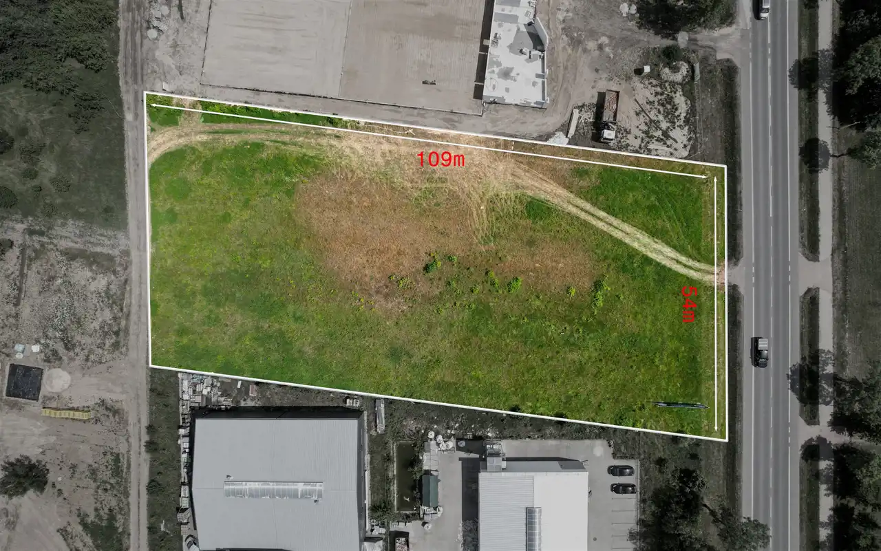 Działka o wymiarach 54m x 109m, posiada dojazd z dwóch stron.
