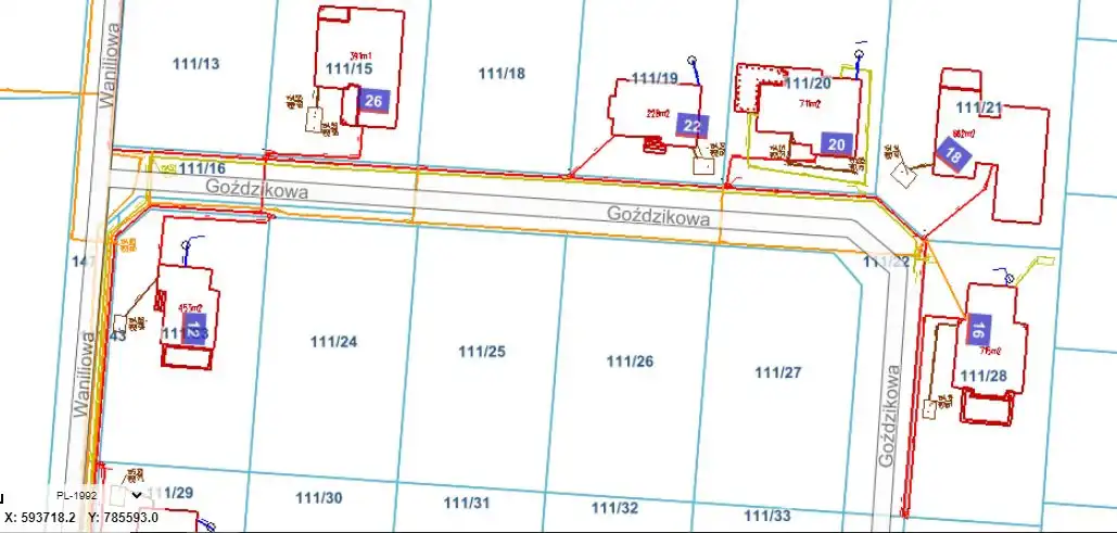 Każda ma 1018m2, znajdują się w bliskiej odległości od ul. Leszczynowej. Nr geodezyjne 111/24, 111/25.