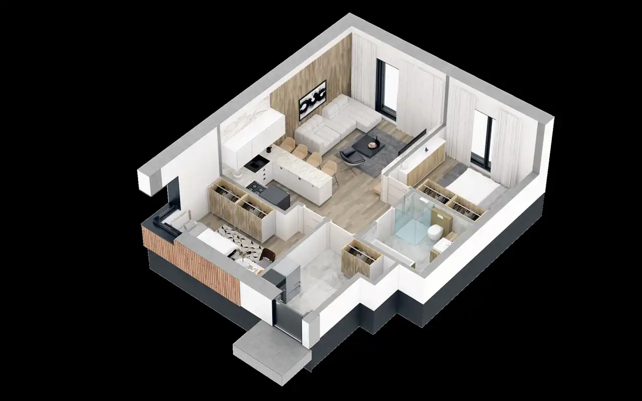 - Charakterystyka mieszkania 53.7 m2, 2 pokoje