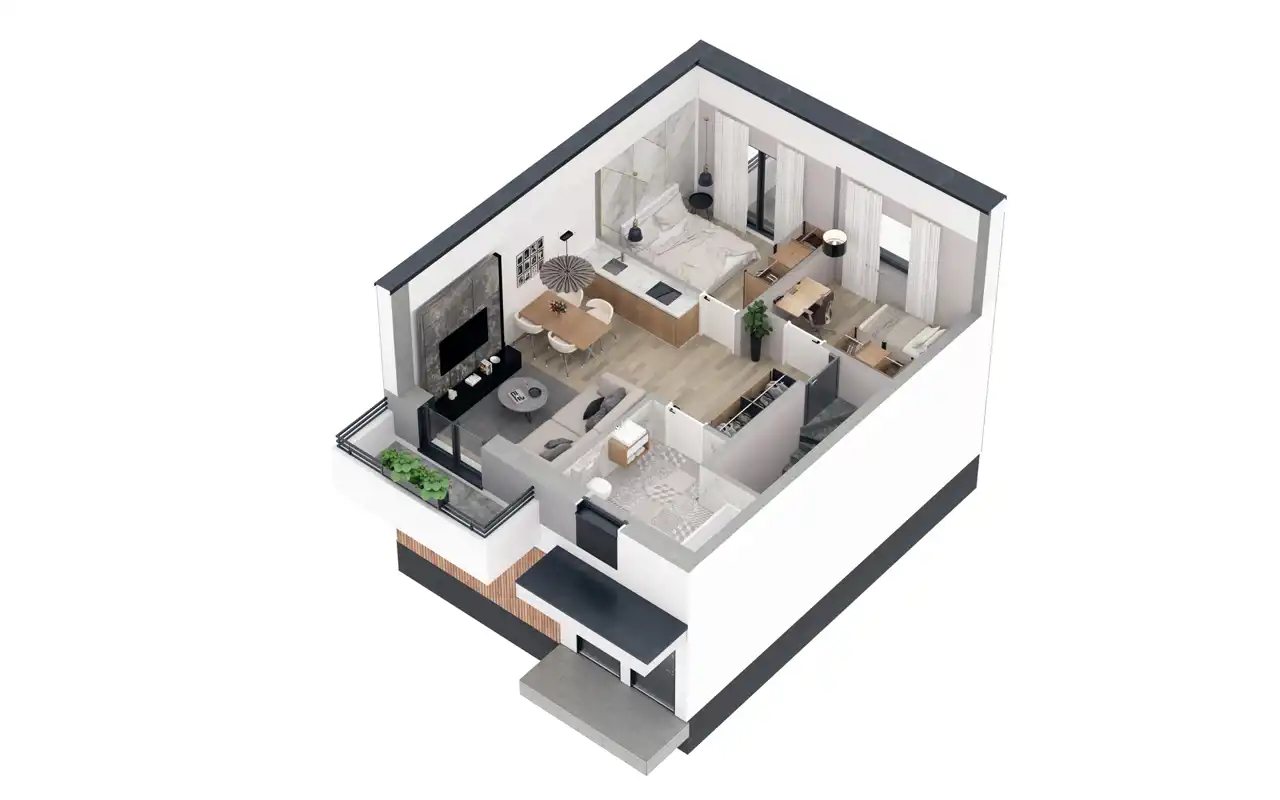 - piętro: 55,30 m2 z dodatkową sypialnią i dwoma balkonami