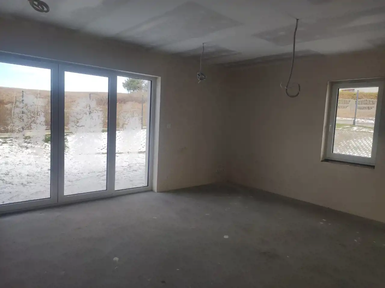 Na sprzedaż dom w zabudowie bliźniaczej o powierzchni 63m2. Nieruchomość w stanie deweloperskim, rozkład według projektu: salon połączony z aneksem kuchennym(26,5m2), pokój(10m2), pokój(11m2), łazienka(4,5m2), korytarz(6m2), pomieszczenie gospodarcze(3m2), wiatrołap(2,6m2). Strych o powierzchni 16m2 do możliwej adaptacji.