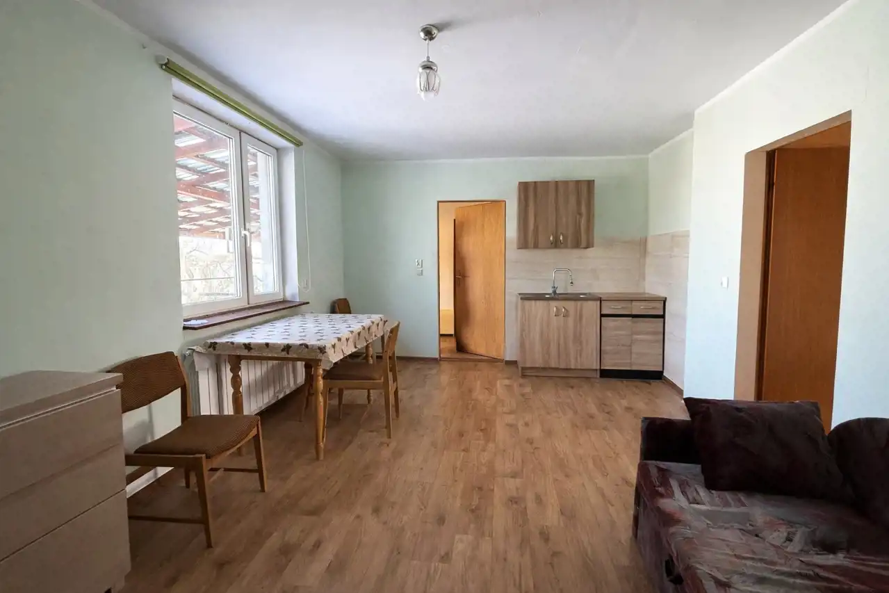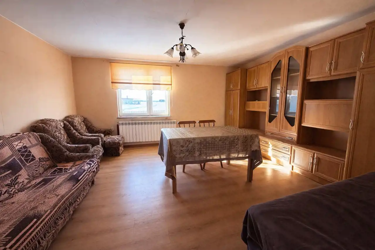 W odnowionej części domu znajduje się przestronna kuchnia z jadalnią, duży ustawny pokój, łazienka z dodatkowym pomieszczeniem oraz korytarz. Druga część domu wymaga remontu i obejmuje dwa dodatkowe pokoje, co daje możliwość dowolnej aranżacji wnętrza według własnych potrzeb.