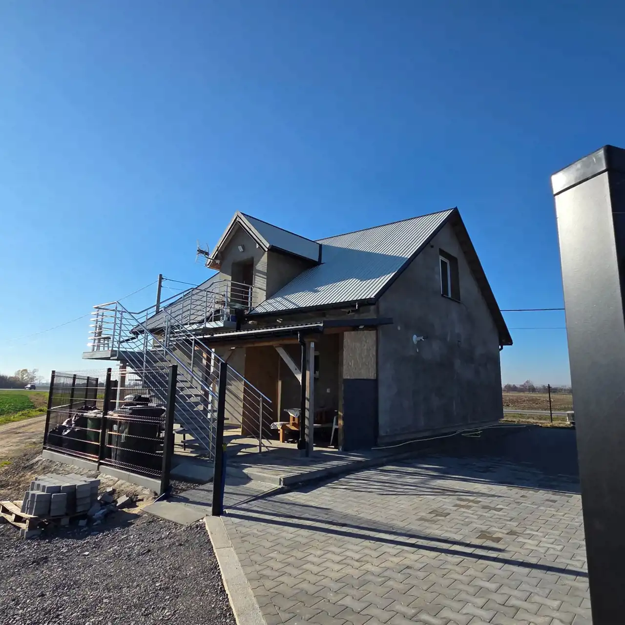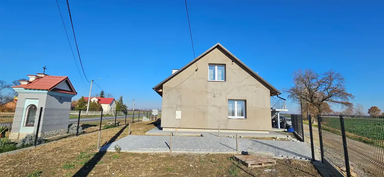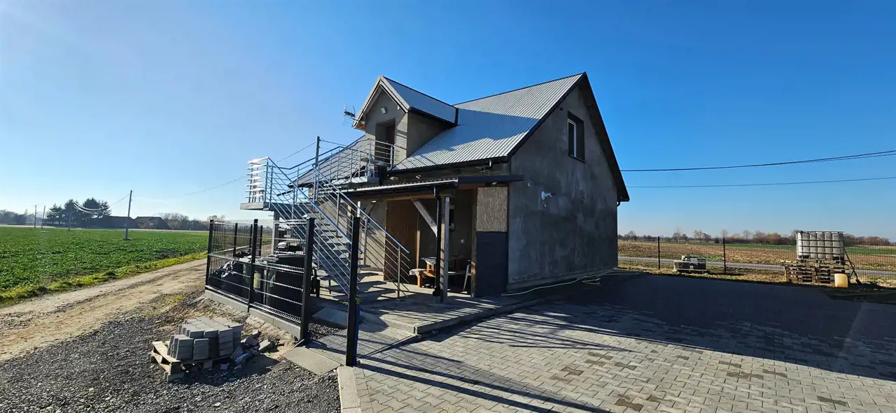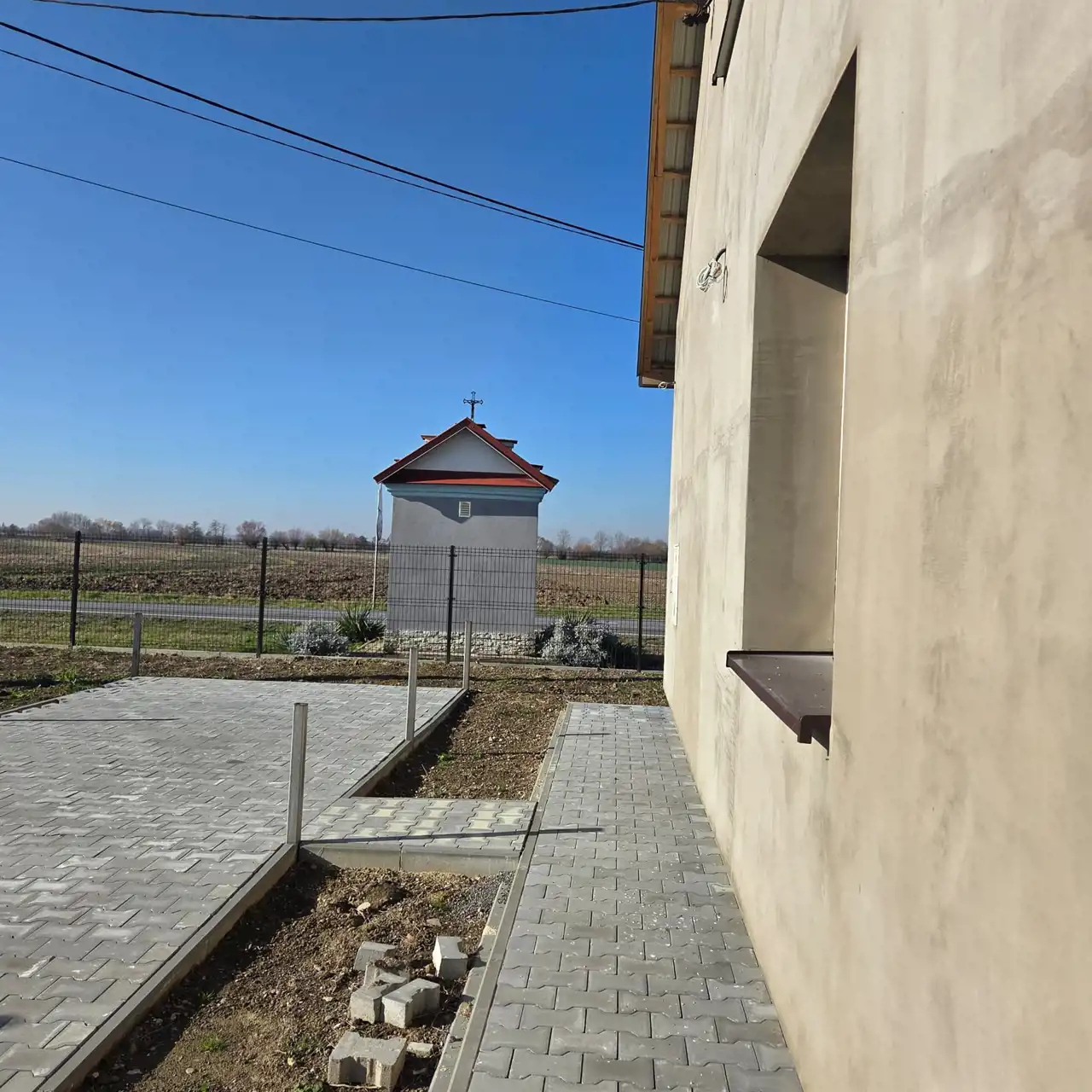 - Dookoła budynku wykonano utwardzenie kostką brukową oraz przygotowano zewnętrzne miejsca parkingowe.