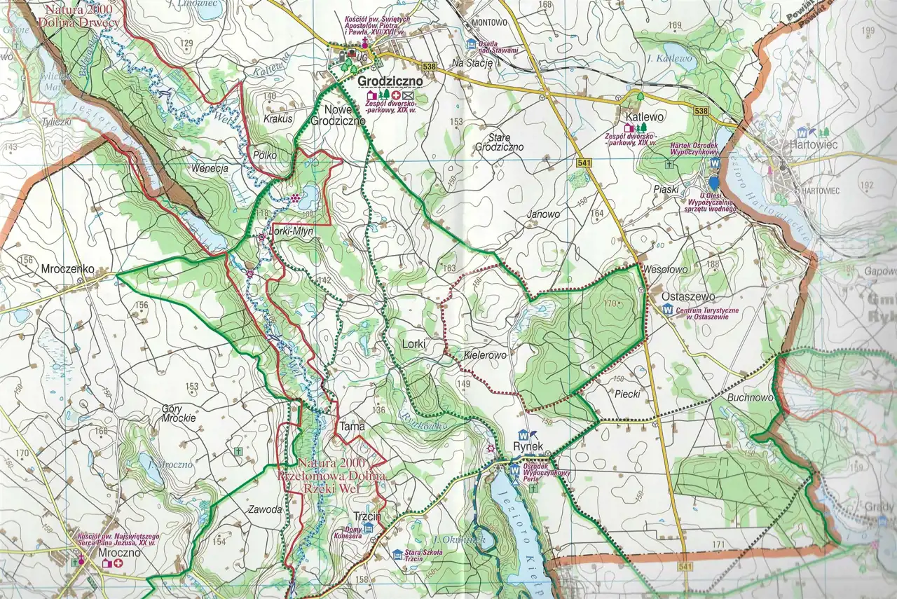 - Grodziczno otoczone jest jeziorami, m.in. Hartowieckim, Tylickim i Kiełpińskim - pow. 80 ha i głęb. 12m