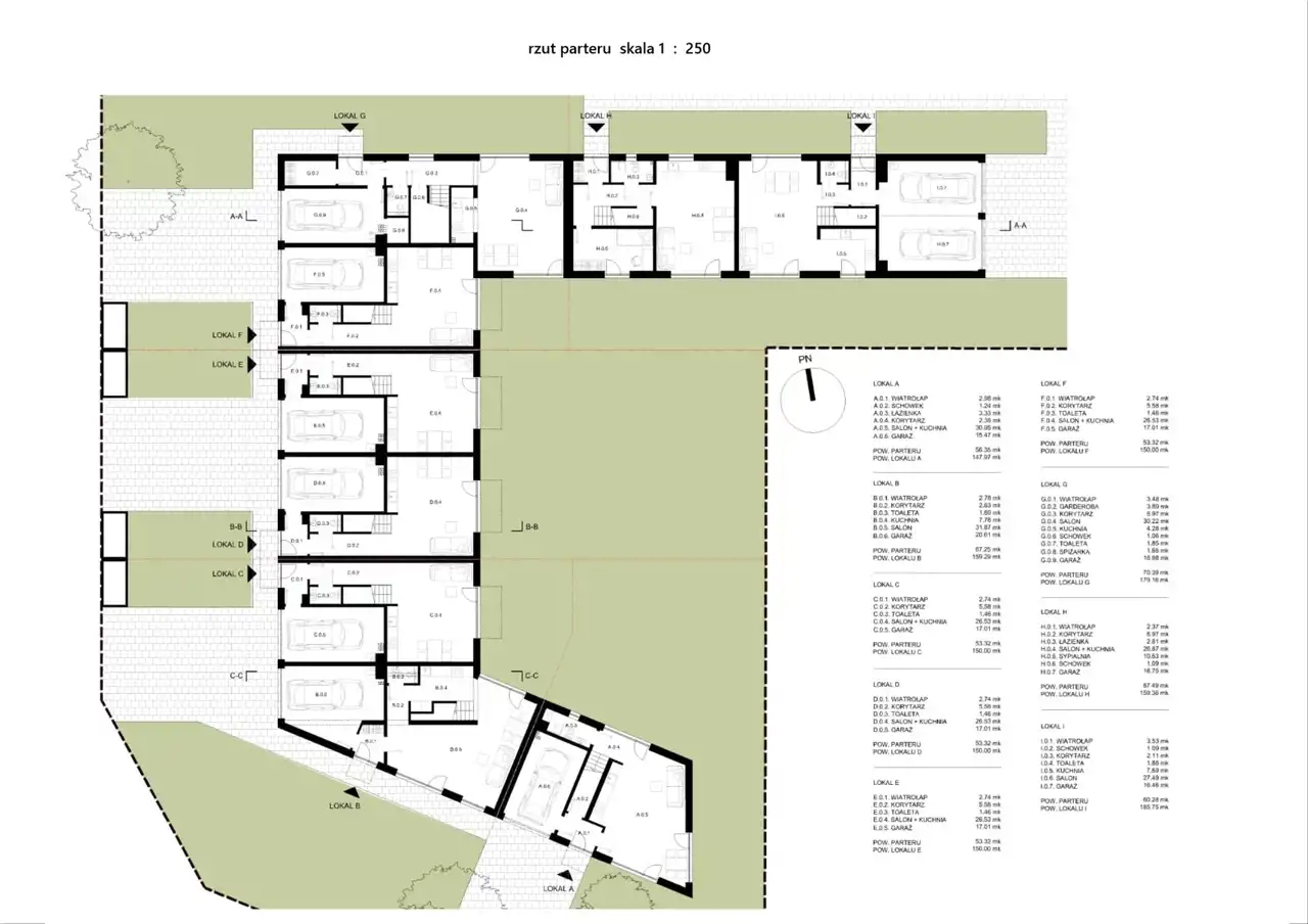 - 9 segmentów w zwartej zabudowie (3 budynki dwulokalowe i jeden jednolokalowy) o powierzchni od 147 m2 do 185 m2,