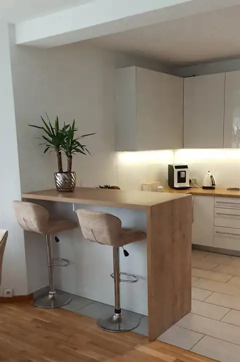 - salon ( z kominkiem) i kuchnią otwartą o łącznej powierzchni 35,6 m2 . Z salonu jest wyjście przez taras o pow. 50 m2 do ogrodu. W salonie jest drewniana dębowa podłoga, w kuchni terakota.