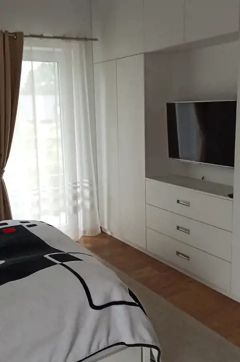 Plastikowe 2-szybowe okna są zasłaniane automatycznymi roletami.