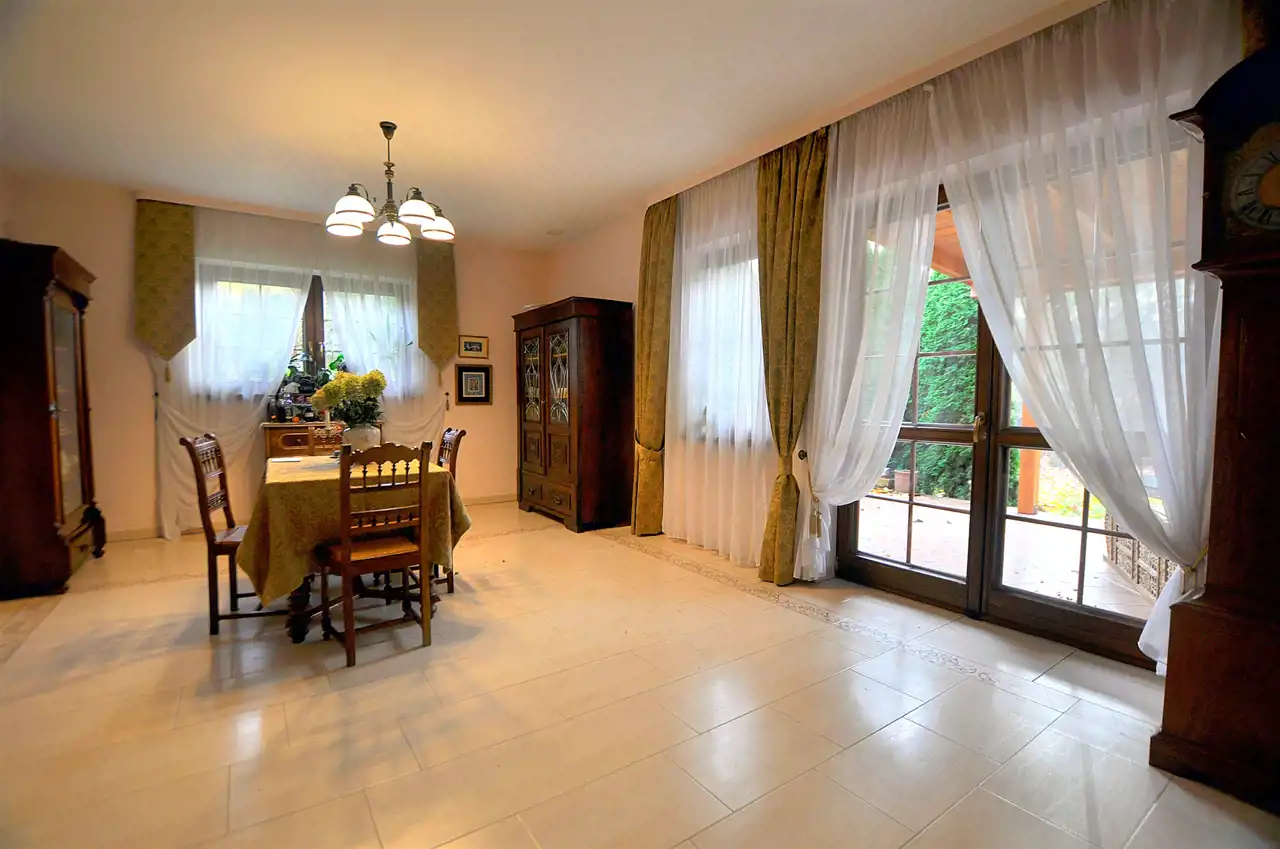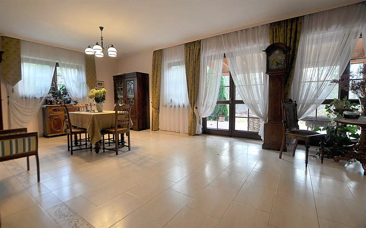 Co wyróżnia tę nieruchomość: duża, prawie 1500-metrowa działka, pełna zieleni i przestrzeni do relaksu, przemyślany układ pomieszczeń – aż 6 pokoi, w tym przytulny salon, jadalnia z widokiem na ogród i funkcjonalna kuchnia. Garaż na dwa samochody w bryle budynku.