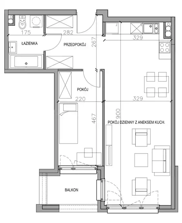 Mieszkanie jest w pełni umeblowane i wyposażone w sprzęty AGD ( lodówko -zamrażarka, płyta indukcyjna, piekarnik, zmywarka, pralka, okap) i składa się z: salonu z aneksem kuchennym, sypialni, łazienki ( z wanną i wc), przedpokoju otwartego na mieszkanie ,loggi . Z uwagi na duże okna jest ono dobrze doświetlone .