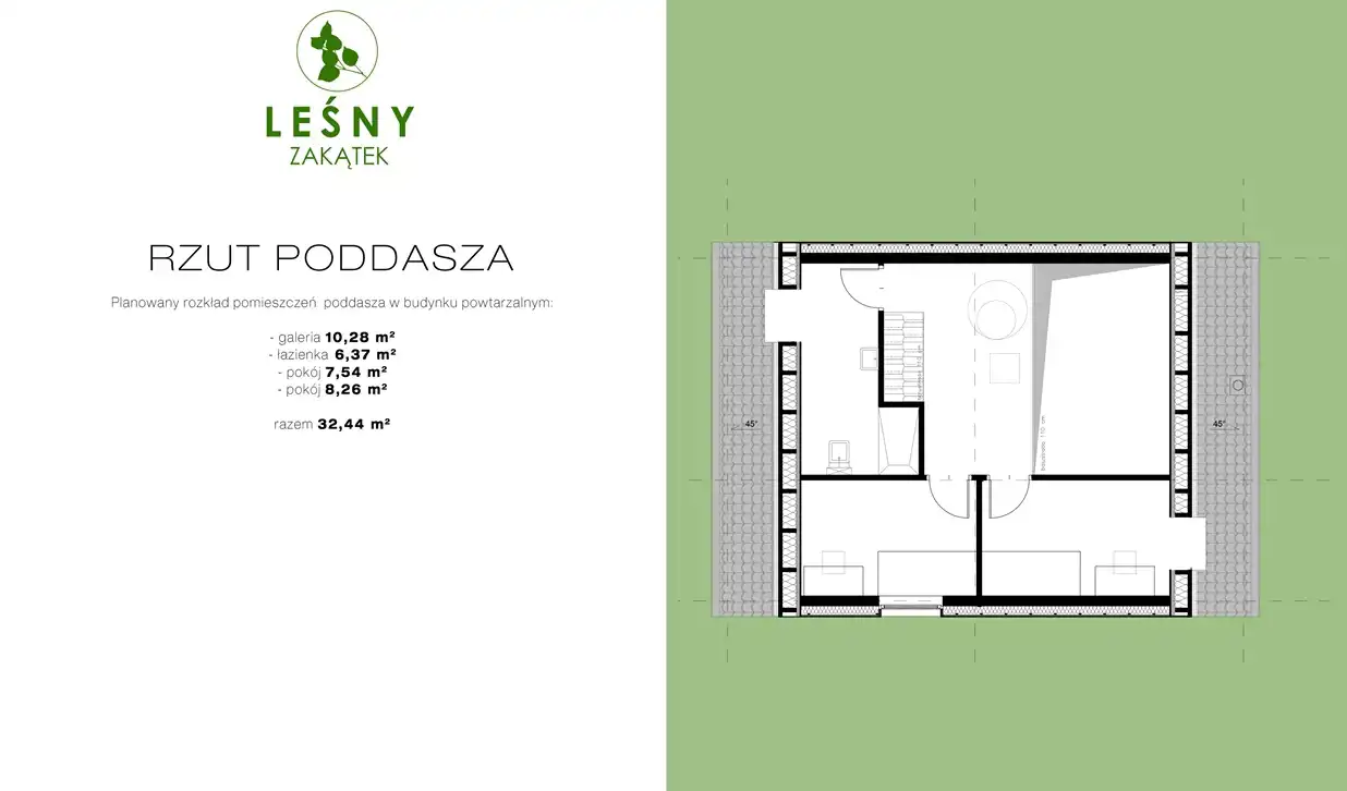 Każdy z domów ma powierzchnię 88,24 m² i składa się z dwóch kondygnacji – parteru oraz antresoli.