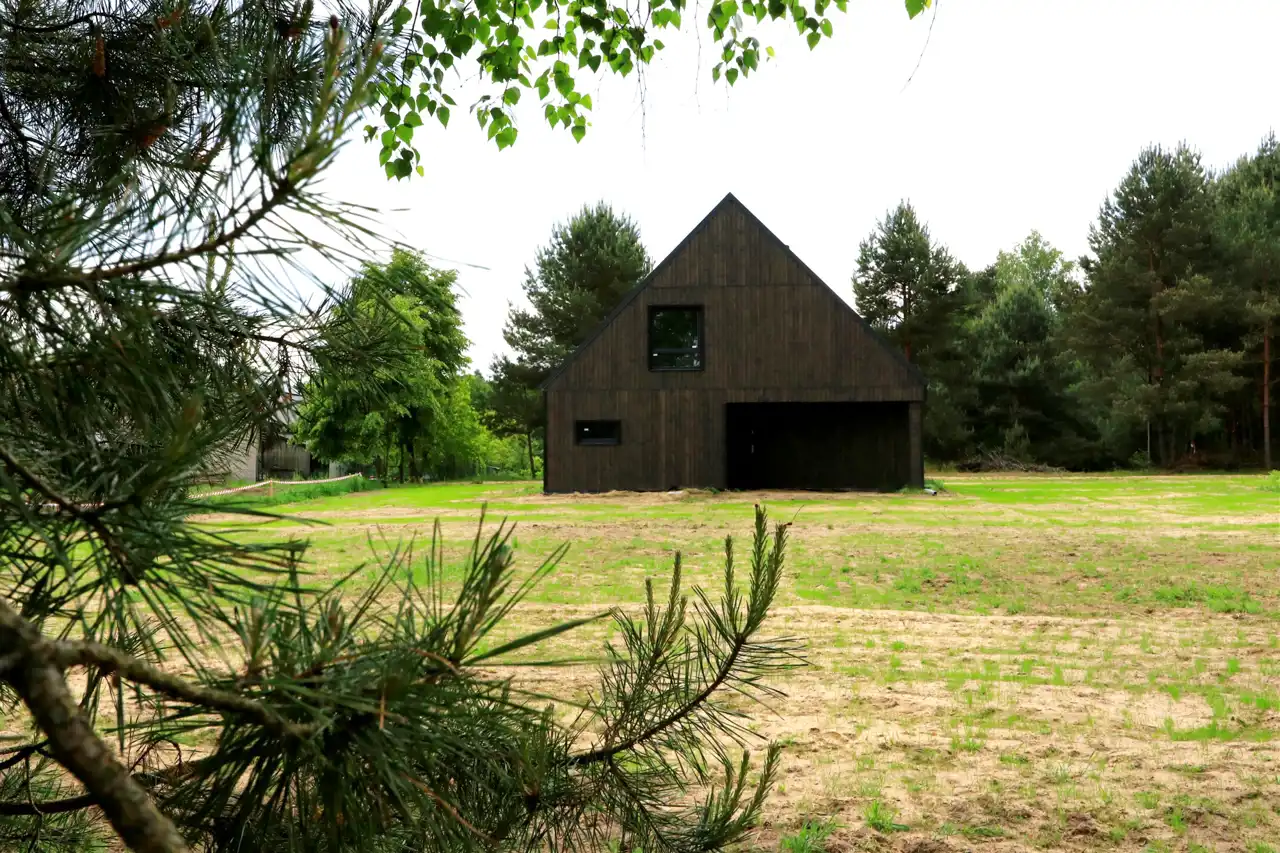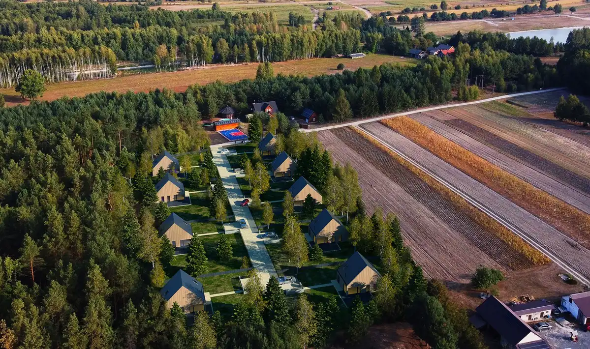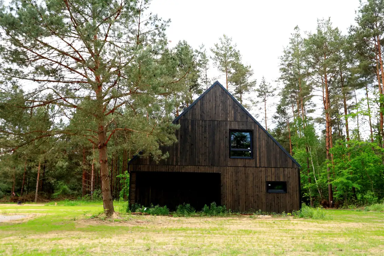Otoczenie domów zaprojektowano z myślą o zachowaniu jak największej ilości zieleni. Duże przeszklenia pozwalają cieszyć się bliskością natury o każdej porze dnia, a elewacja z ciemnego drewna i prosta, nowoczesna forma budynków doskonale wpisują się w leśny krajobraz, tworząc przytulną i harmonijną przestrzeń.