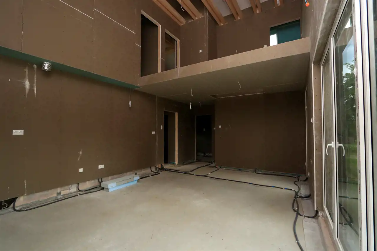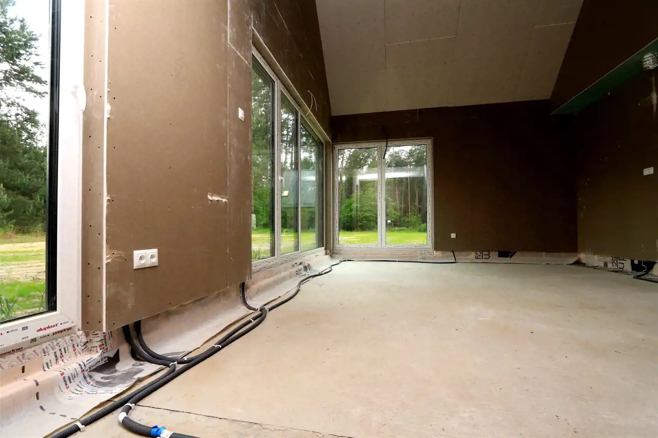 W domu właśnie wykonywane są instalacje wodno-kanalizacyjne oraz ogrzewanie podłogowe. Instalacja elektryczna jest już wykonana.