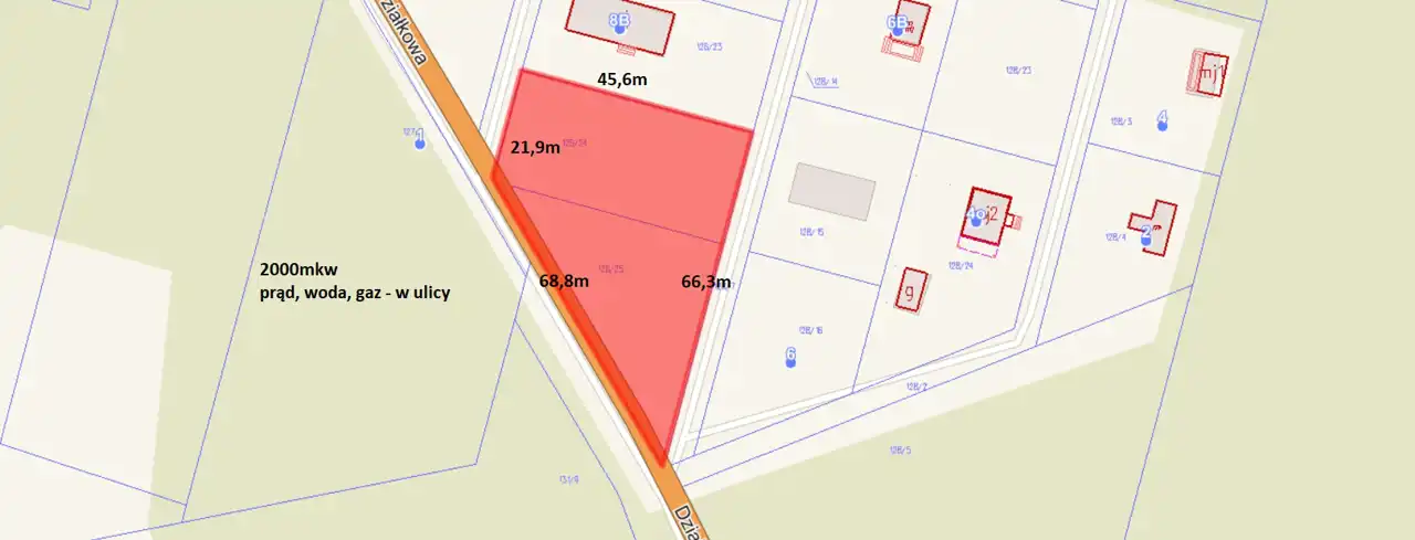 - Media Woda: w ulicy; Kanalizacja: brak; Prąd: w ulicy; Gaz: w ulicy