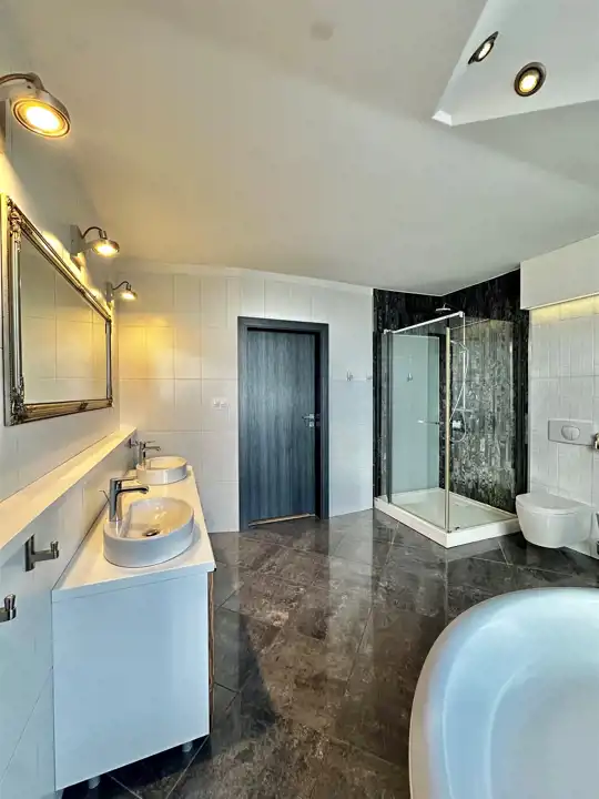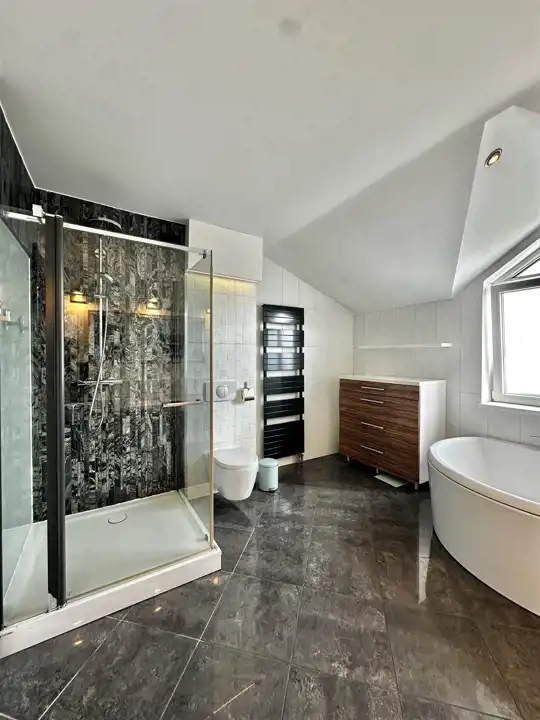 - łazienka z pełnym wyposażeniem z wanną oraz prysznicem