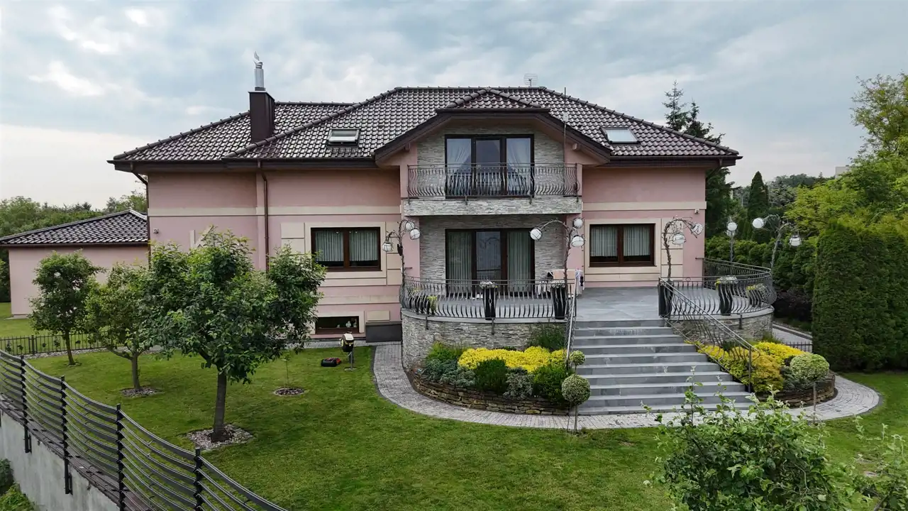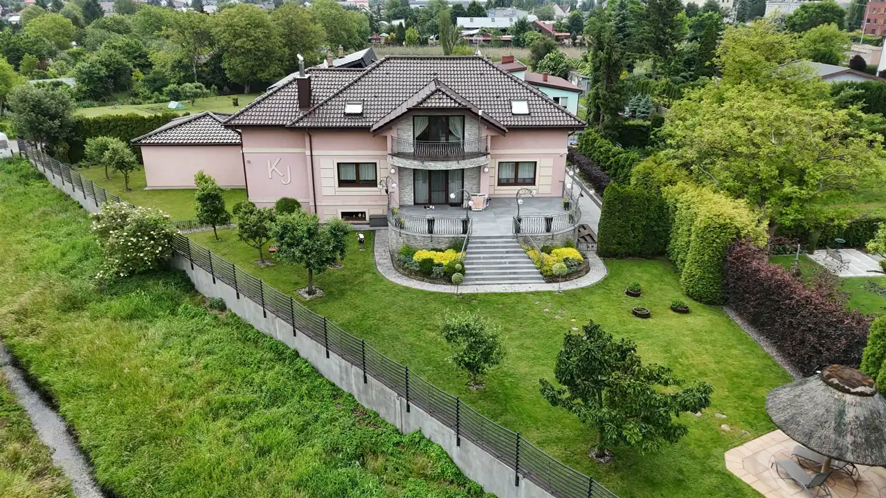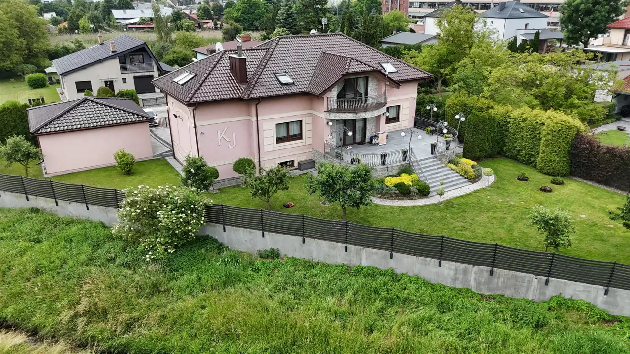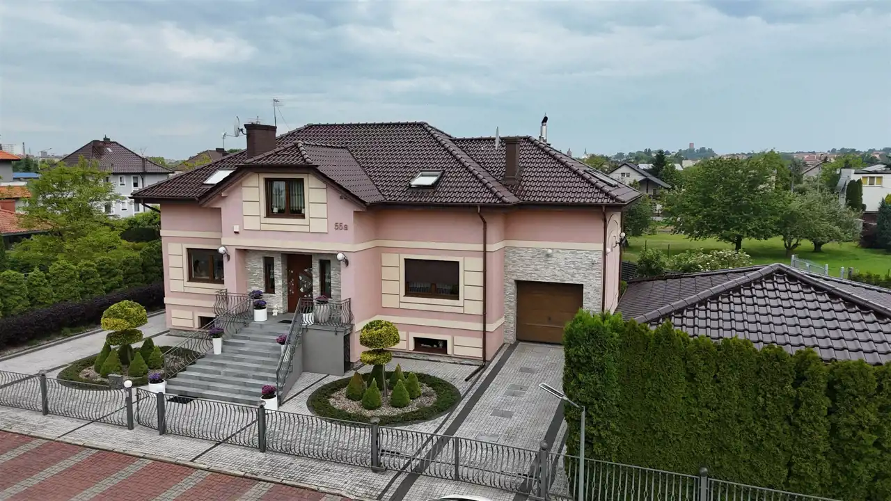 Dom posiada garaż jednostanowiskowy w bryle budynku o powierzchni 25 m2, a także oddzielny, wolnostojący, murowany garaż dwustanowiskowy o powierzchni 49 m2. Cała działka jest pięknie utrzymana, z licznymi nasadzeniami ozdobnymi, a podjazdy oraz obejście wokół domu zostały starannie wykostkowane. Brama wjazdowa oraz bramy garażowe są sterowane elektrycznie, a przed wejściem znajdują się również wygodne miejsca parkingowe dla gości.