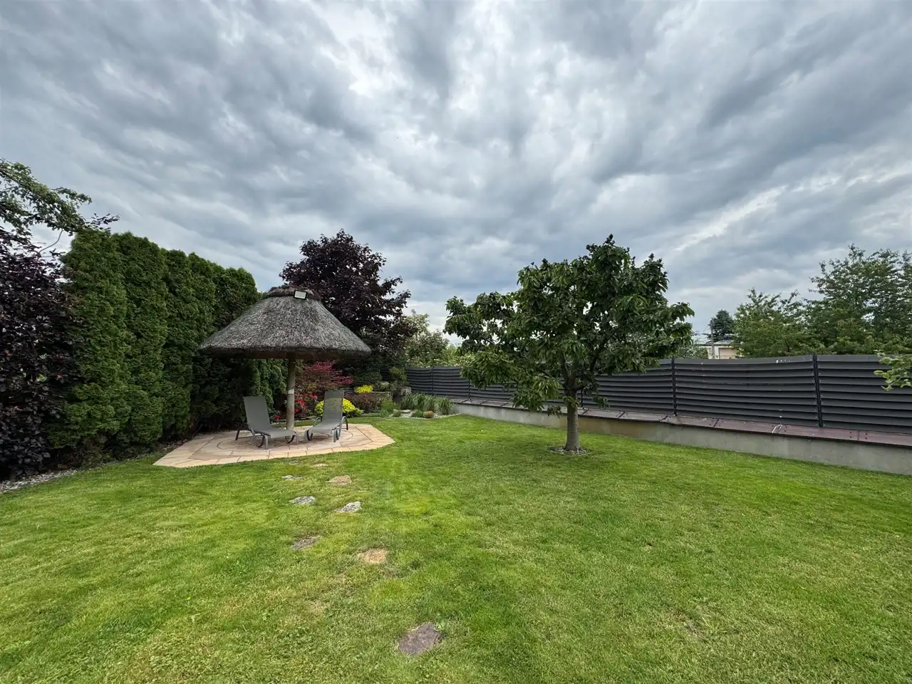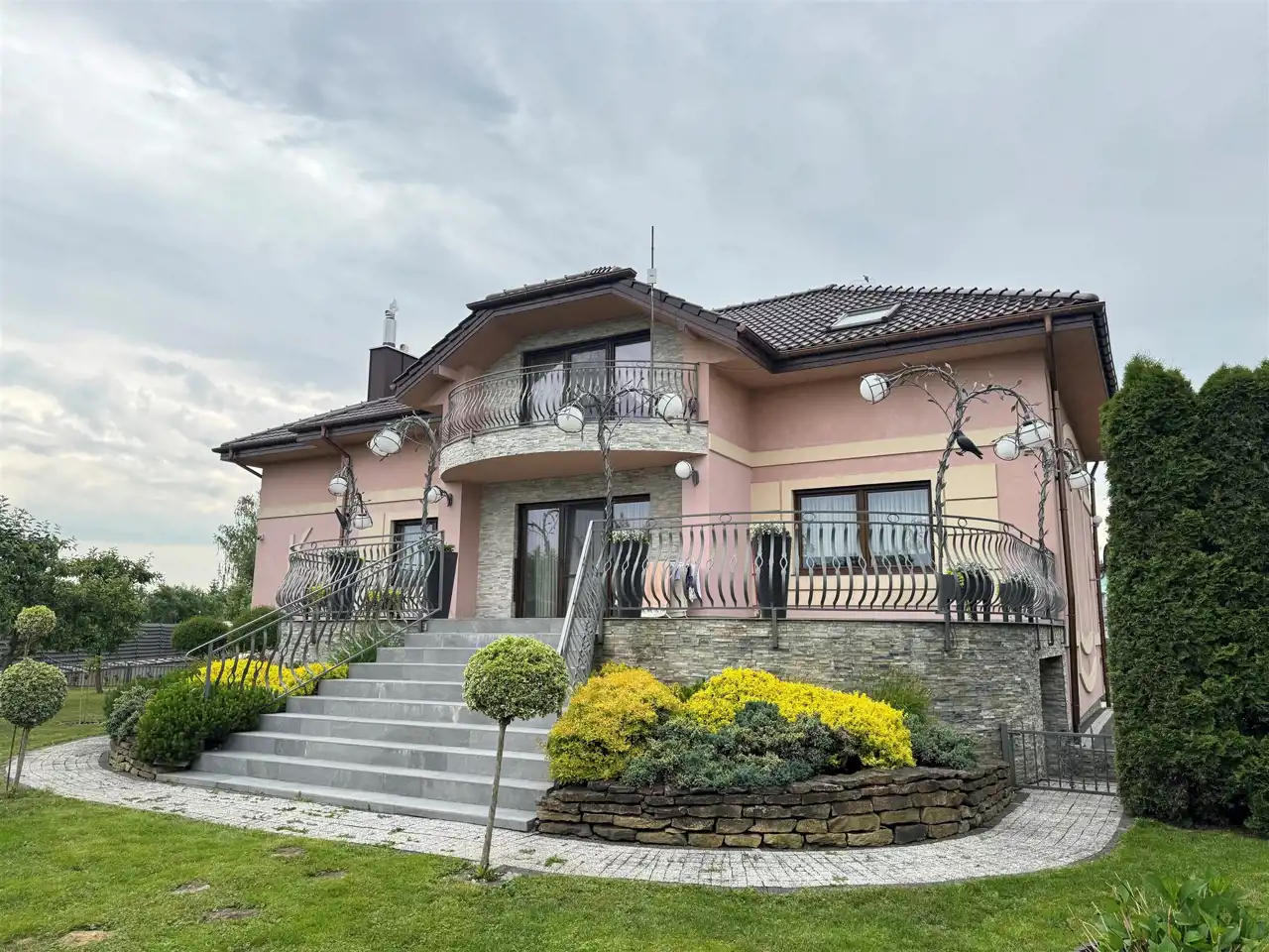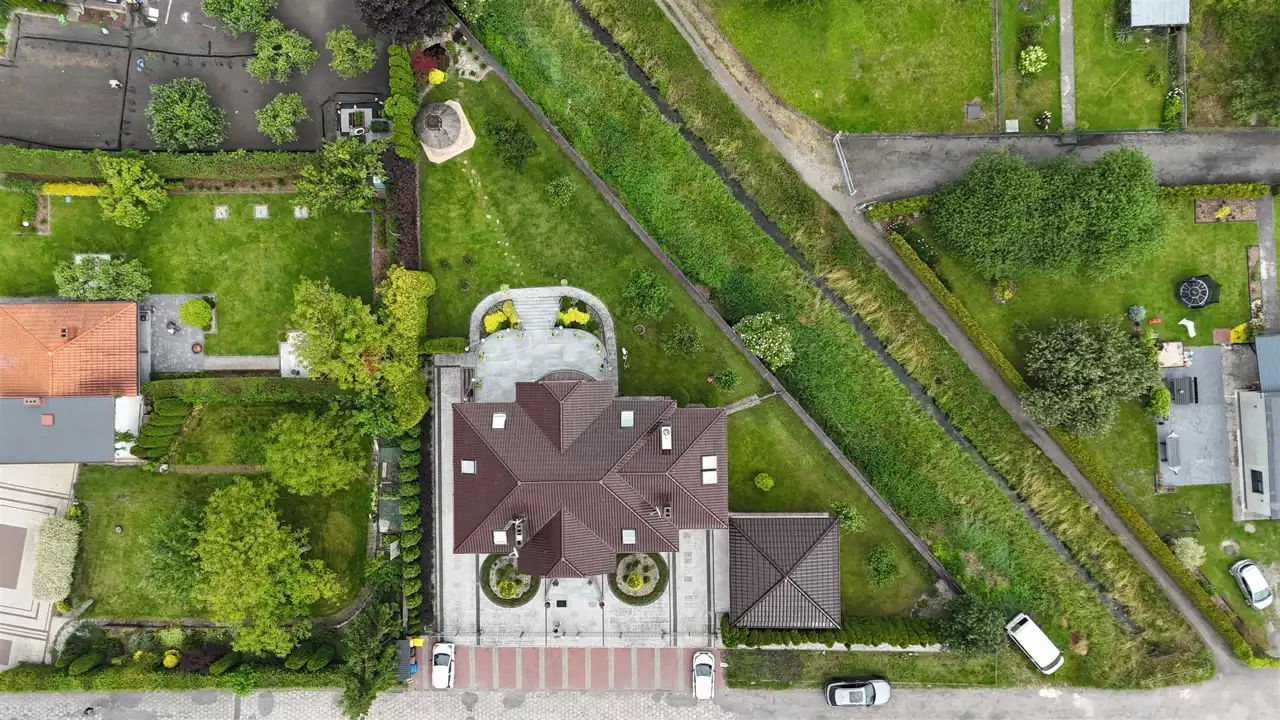 Dom posiada garaż jednostanowiskowy w bryle budynku o powierzchni 25 m2, a także oddzielny, wolnostojący, murowany garaż dwustanowiskowy o powierzchni 49 m2. Cała działka jest pięknie utrzymana, z licznymi nasadzeniami ozdobnymi, a podjazdy oraz obejście wokół domu zostały starannie wykostkowane. Brama wjazdowa oraz bramy garażowe są sterowane elektrycznie, a przed wejściem znajdują się również wygodne miejsca parkingowe dla gości.