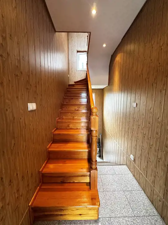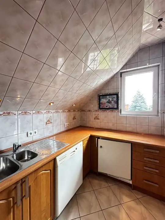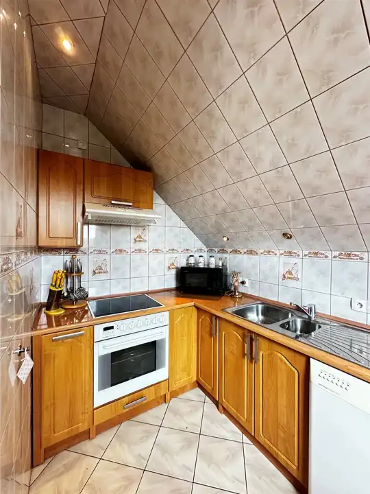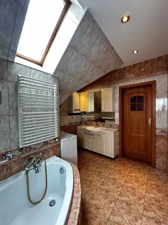 Wysoka jakość wykonania – dom budowany z solidnych materiałów, dach pokryty dachówką ceramiczną, drewniane schody, kamienne płytki i panele na podłogach.