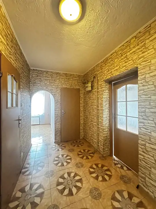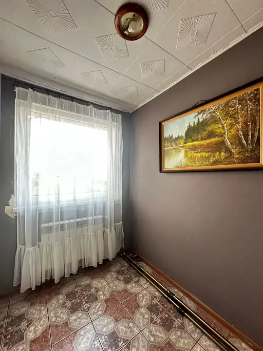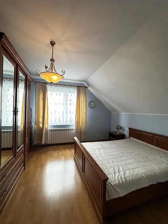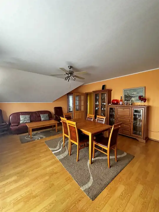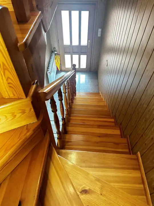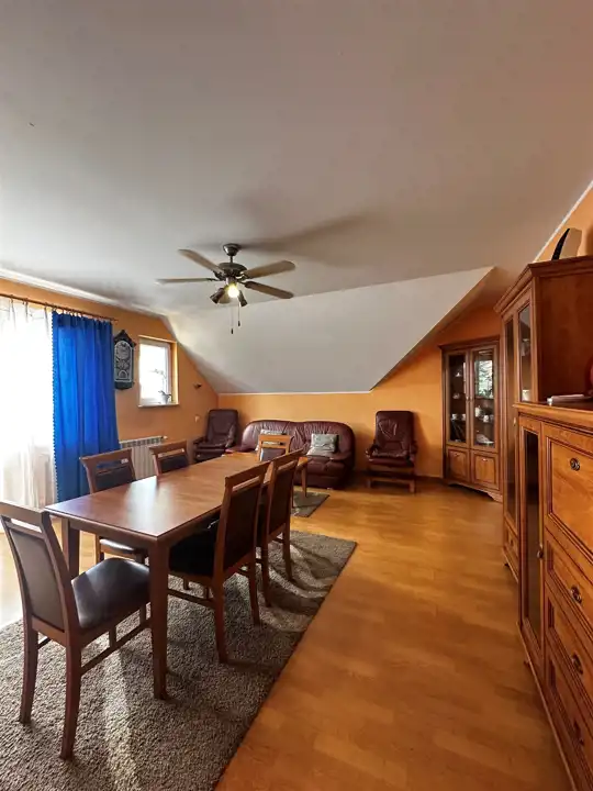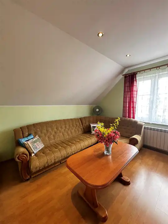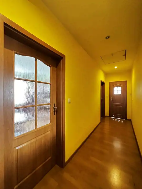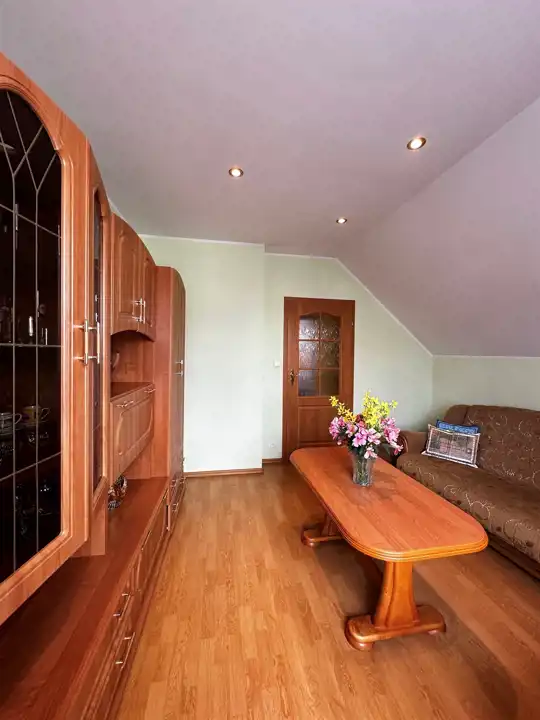 - Pierwsze mieszkanie (piętro): 3 pokoje, kuchnia, łazienka z wanną i prysznicem, korytarz, przedpokój, wejście na strych.