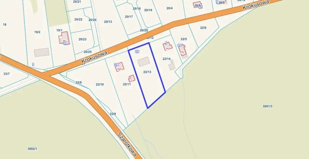 Nieruchomość położona jest przy ul. Krokusowej, na działce o powierzchni 2302 m² (działka nr 22/13, obręb 158). To wyjątkowe miejsce dla osób ceniących prywatność, ciszę i bliskość natury, a jednocześnie chcących korzystać z wygody życia w mieście.