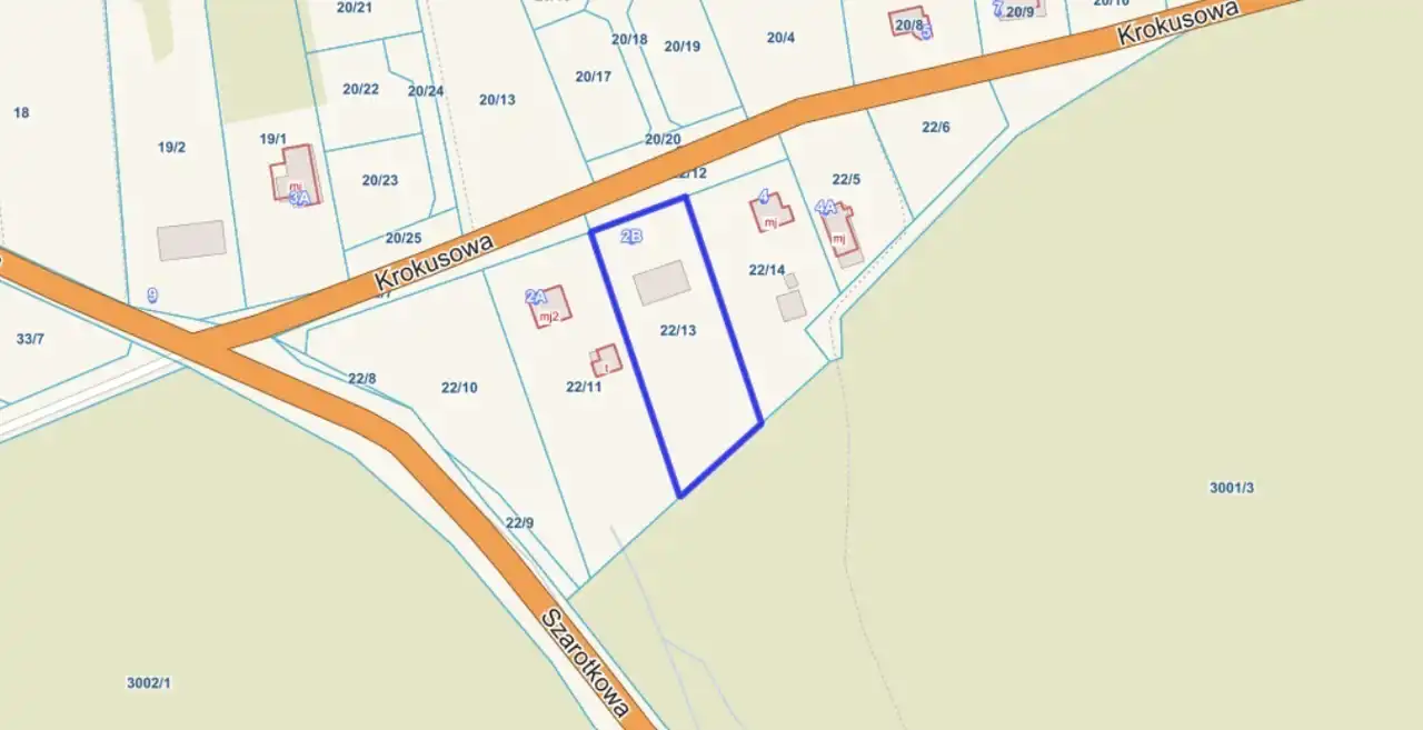 Nieruchomość położona jest przy ul. Krokusowej, na działce o powierzchni 2302 m² (działka nr 22/3, obręb 158). To wyjątkowe miejsce dla osób ceniących prywatność, ciszę i bliskość natury, a jednocześnie chcących korzystać z wygody życia w mieście.