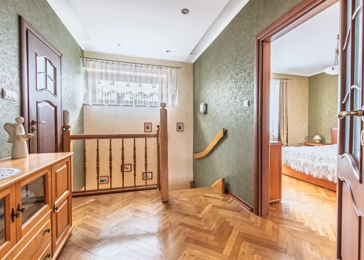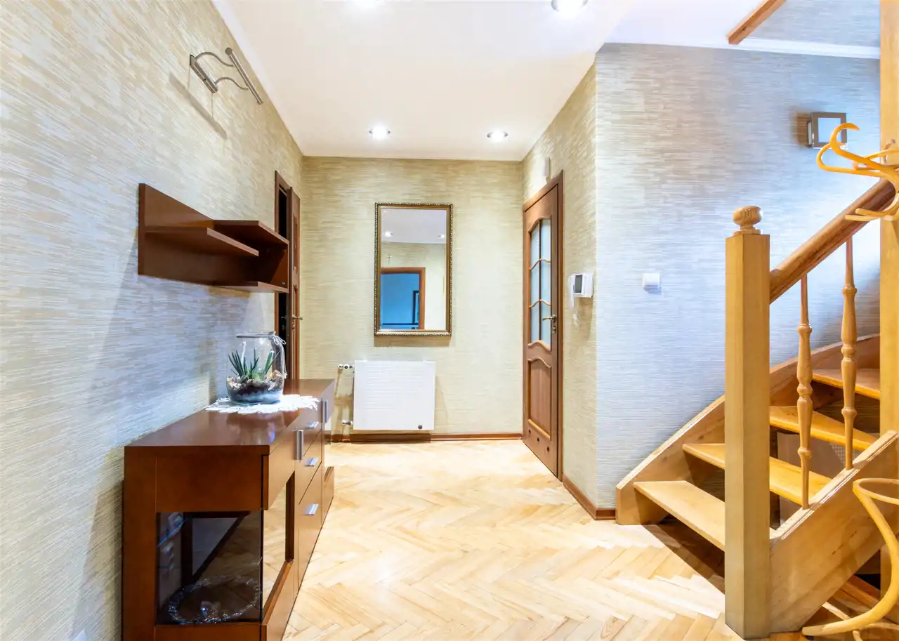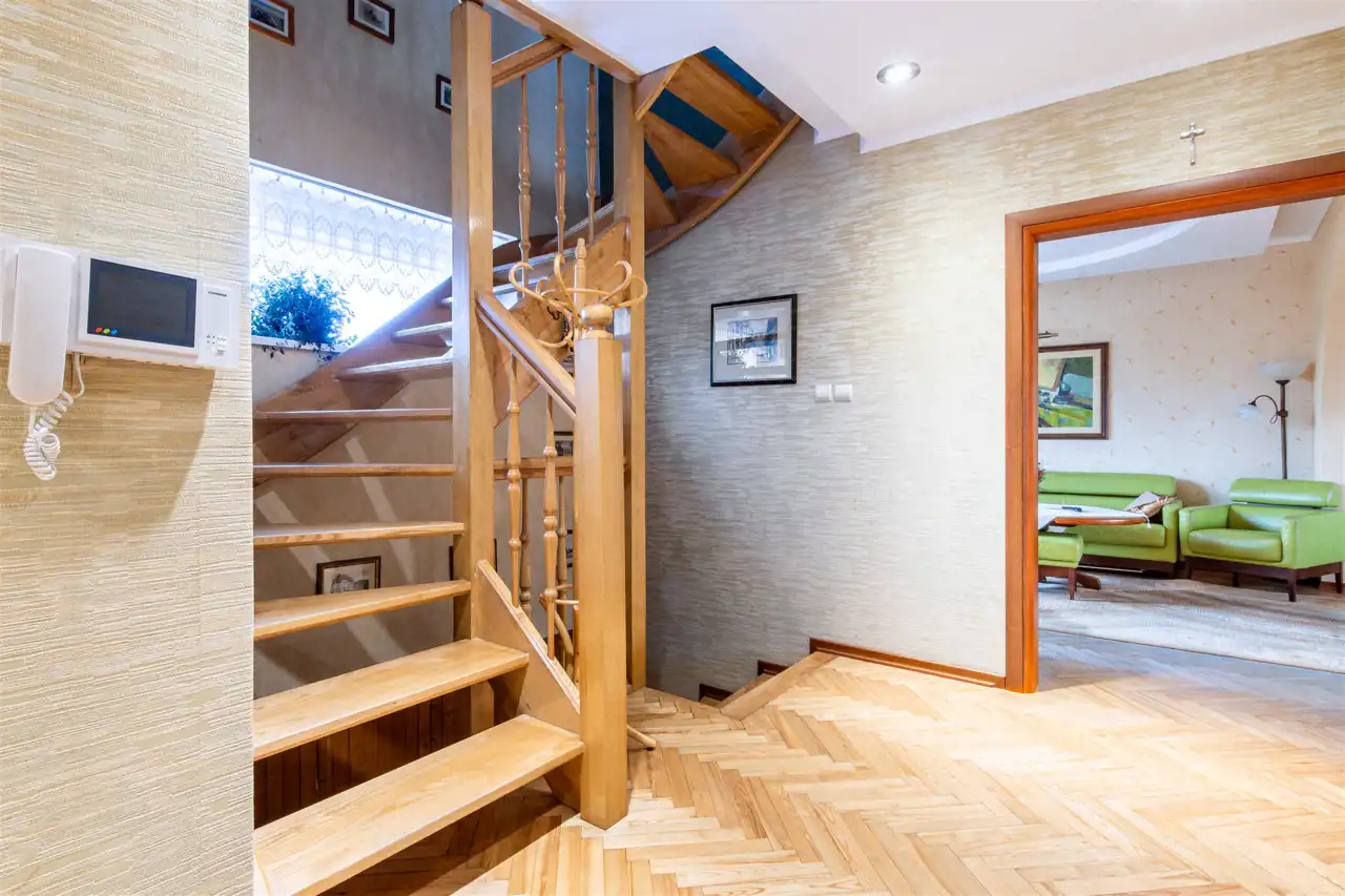 Nieruchomość zaprojektowano z myślą o zapewnieniu komfortu jego mieszkańcom, urządzono z dbałością o każdy detal. Zastosowanie delikatnych barw sprawia, że wnętrze jest ciepłe i przytulne. Podłogi oraz schody wyłożono parkietem drewnianym (jesion). W cenie nieruchomości uwzględniono całe wyposażenie.