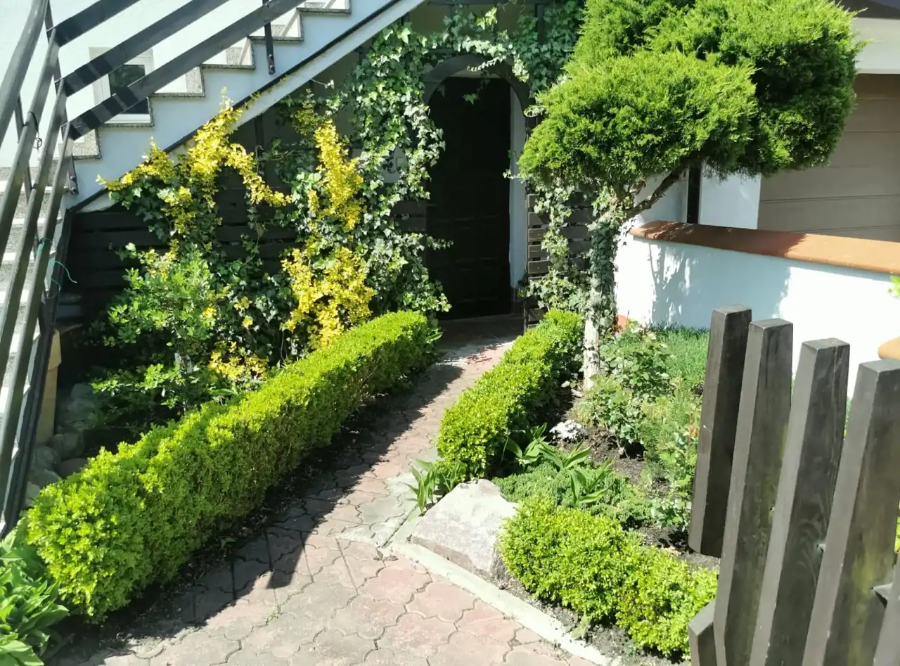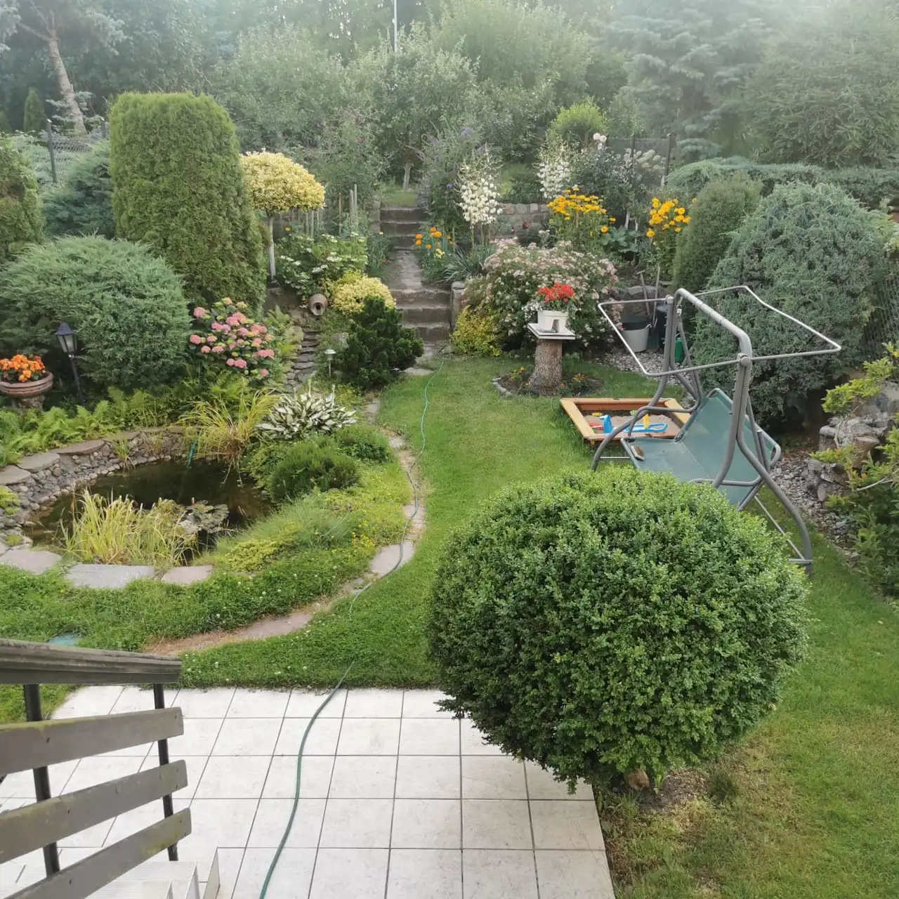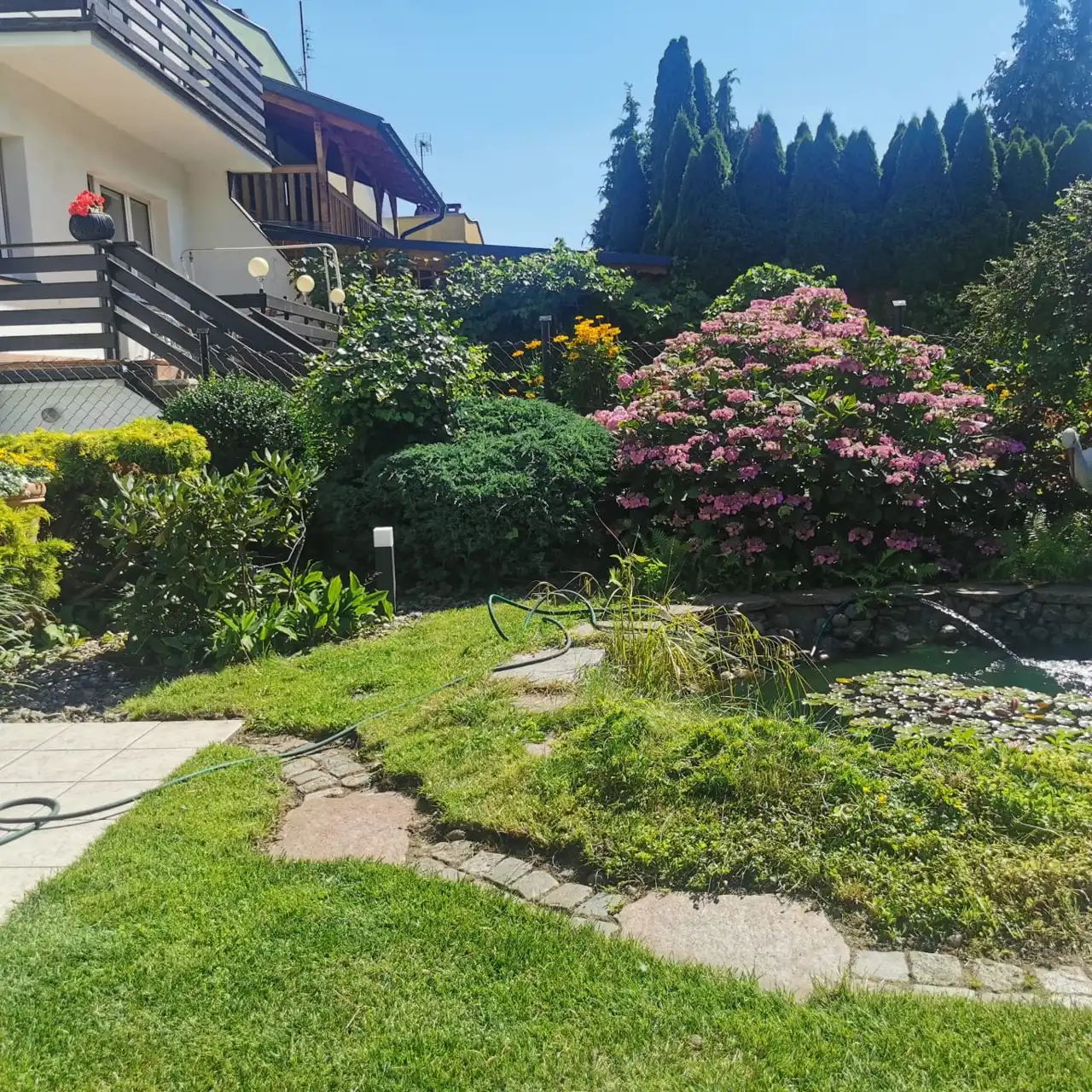 Ogród został starannie zaprojektowany i zachwyca bogatą roślinnością, różnorodnymi krzewami oraz drzewami ozdobnymi, które tworzą naturalny klimat i zapewniają pełną prywatność.
