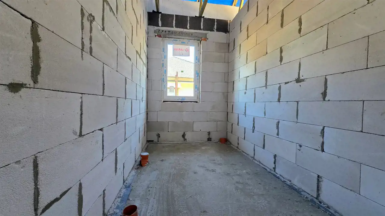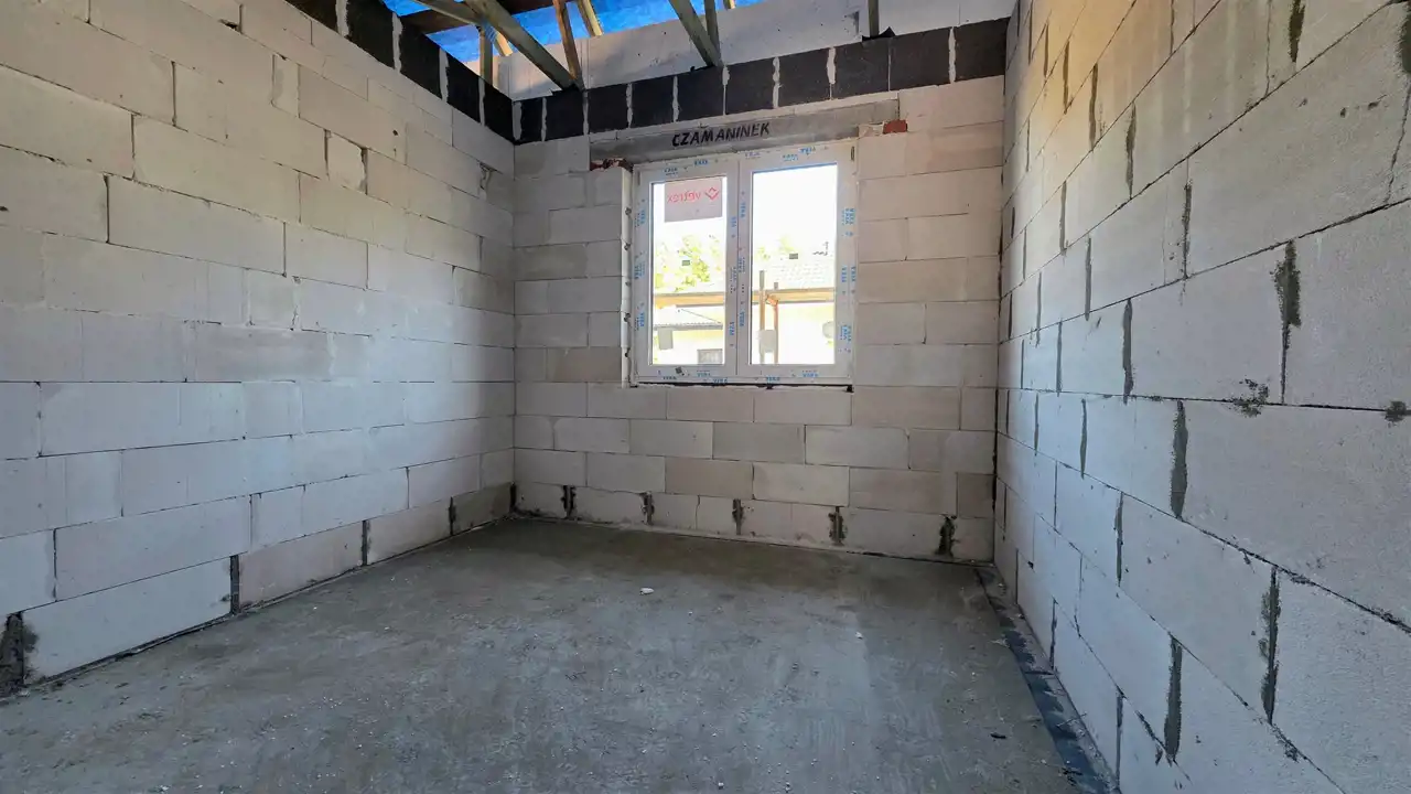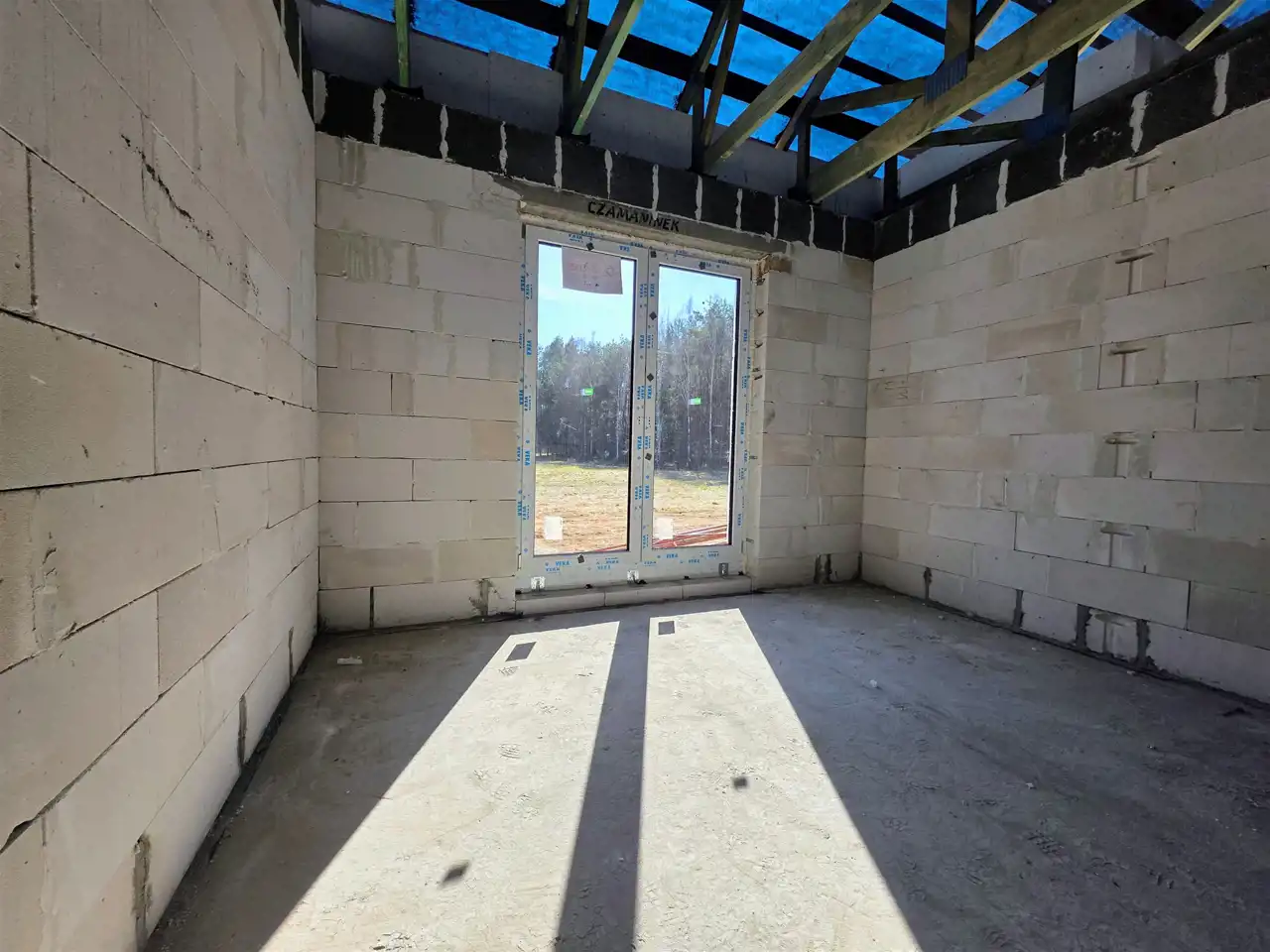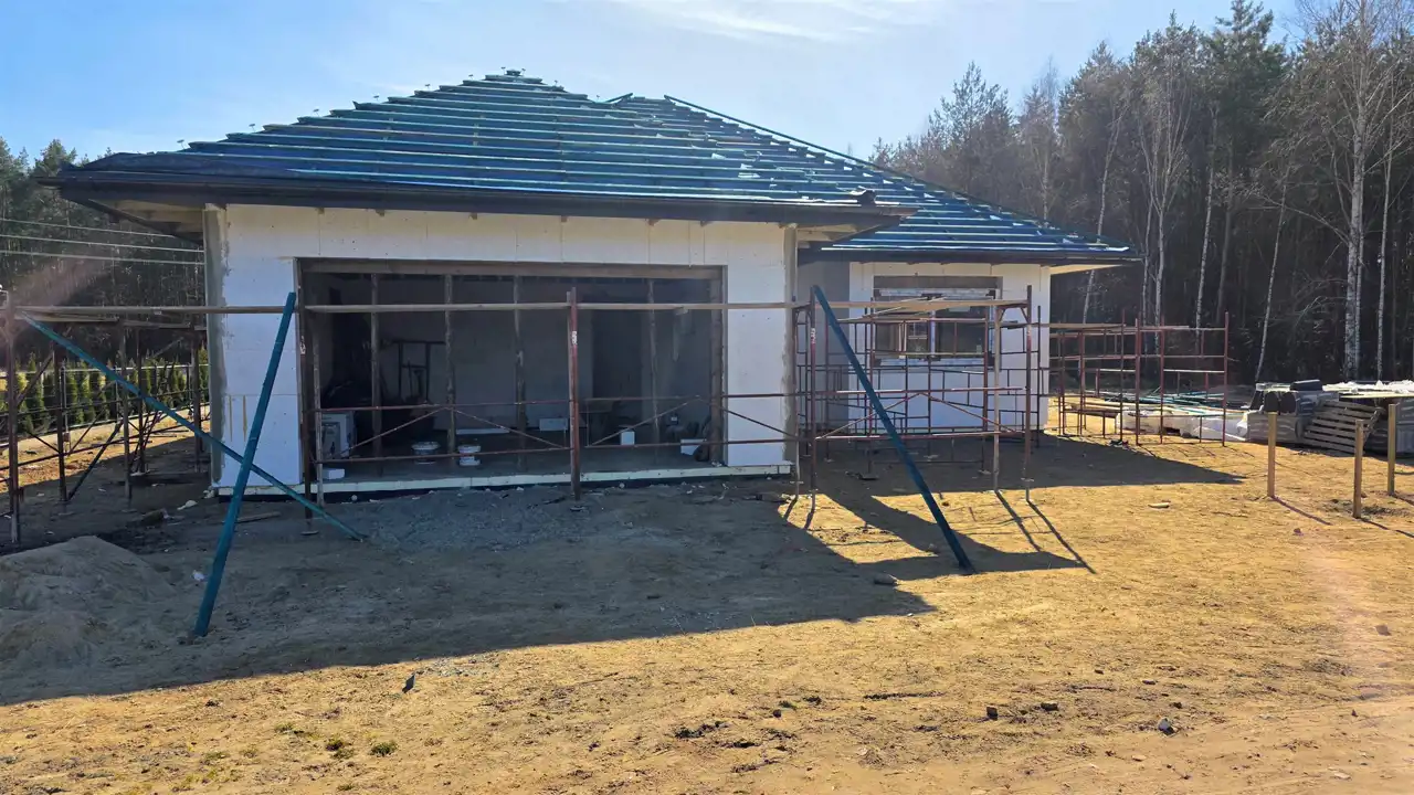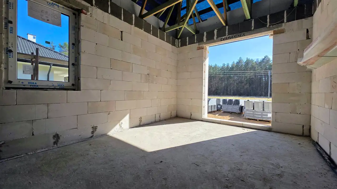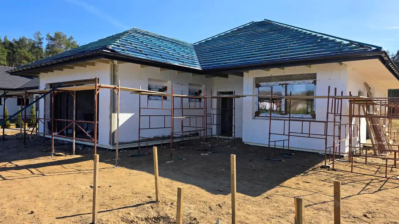 Ściany konstrukcyjne wybudowane będą z betonu komórkowego, który charakteryzuje się bardzo dobrą wytrzymałością, izolacyjnością cieplną i akustyczną, ocieplone zostaną styropianem o grubości 20 cm. Elewacja budynku wykonana będzie z białego tynku. Ściany wewnętrzne działowe murowane będą z gazobetonu o grubości 12 cm oraz wykończone zostaną tynkiem maszynowo - gipsowym. Strych będzie ocieplony wełną celulozową grubości 35 cm, która zapewnia wysoką izolacyjność termiczną. a na poddaszu będzie wykonana konstrukcja lekka, płyta gipsowo - kartonowa. W budynku zamontowane zostaną energooszczędne okna firmy Vetrex w kolorze złoty dąb z zewnątrz, (w środku białe), które charakteryzują się dobrą izolacyjnością termiczną. W salonie będą wstawione drzwi tarasowe -przesuwne, które łączą dom z ogrodem w najbardziej komfortowy sposób. Rozwiązanie drzwi tarasowych rozświetla pomieszczenia, ułatwiają komunikację i otwierają przestrzeń. Dodatkowo we wszystkich oknach zamontowane będą antywłamaniowe rolety zewnętrzne z napędem elektrycznym sterowane na pilota. Konstrukcja dachu wielospadowego o kącie nachylenia 25o będzie pokryta dachówką cementową firmy Creaton Göteborg Planar z myślą o nowoczesnej architekturze. W nieruchomości rozprowadzona zostanie po całym domu instalacja elektryczna, wodno - kanalizacyjna, oraz instalacja ogrzewania podłogowego, która będzie sterowana pompą ciepła Samsung EHS SPLIT CLIMATEHUB 9 KW 400 V. Nieruchomość ogrodzona będzie z nowoczesnych paneli modułowych. Taras oraz podjazd do garażu zostanie wyłożony nowoczesną kostką brukową. Brama garażowa firmy Wiśniowski zostanie zamontowana wraz z automatyką. Na działkę nawieziony będzie czarnoziem, który będzie posiany trawą.