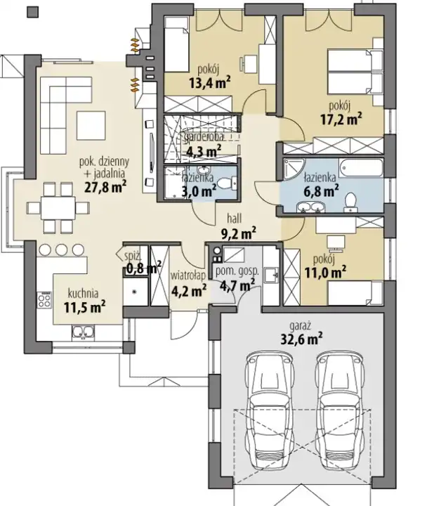 - garaż dwustanowiskowy w bryle budynku 32,6 m2;