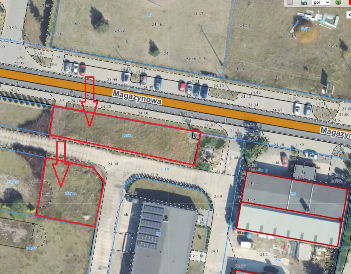 Działka bezpośrednio przy pasie drogowym ma powierzchnię 557 m2 i kształt prostokąta o szerokości frontu około 51,5 metrów, a jej płaski teren stwarza idealne warunki pod inwestycję. Druga działka o powierzchni 422 m2 oddzielona drogą wewnętrzną ma kształt kwadratu o wymiarach około 20,50 m x 20,5 m. Obydwie działki są ogrodzone i posiadają wjazd bezpośrednio z ulicy Magazynowej. W sąsiedztwie znajduje się stacja benzynowa, dwa duże salony samochodowe, liczne budynki o charakterze produkcyjno-handlowo-usługowym i biurowym. Działki znajdują się w strefie o charakterze przemysłowej.
