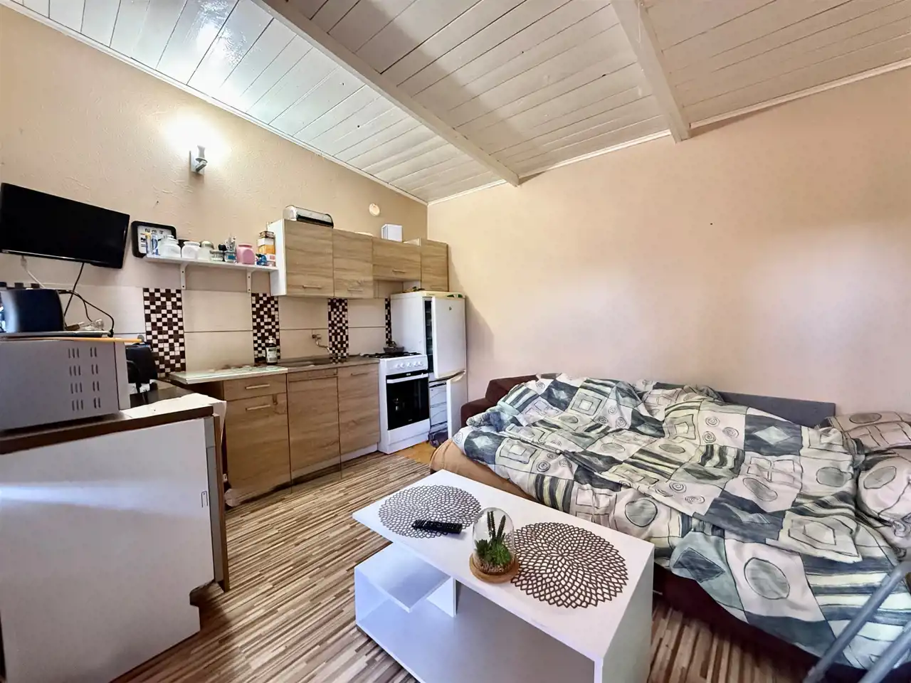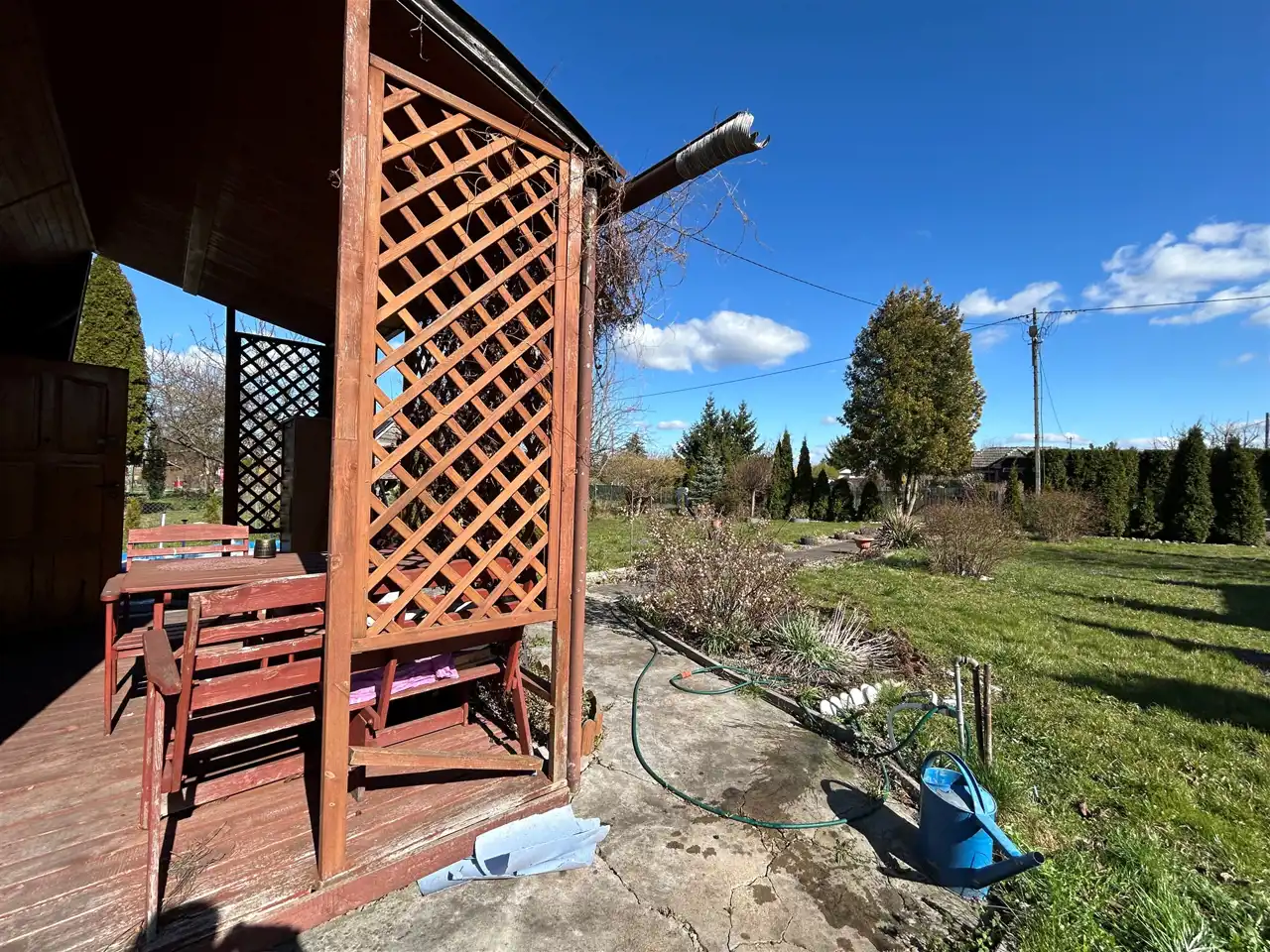 Na działce znajduje się drewniany domek o powierzchni około 20 m² z zabudowanym, zadaszonym tarasem, który stanowi dodatkową przestrzeń do wypoczynku niezależnie od pogody. Wnętrze domku jest w pełni wyposażone i gotowe do użytkowania – w cenie pozostaje zabudowa kuchenna, kuchenka gazowa z piekarnikiem, lodówka, zmywarka, mikrofalówka, telewizor, zestaw audio, rozkładana kanapa, stolik oraz szafka. To oznacza, że możesz zacząć korzystać z działki od razu po zakupie.
