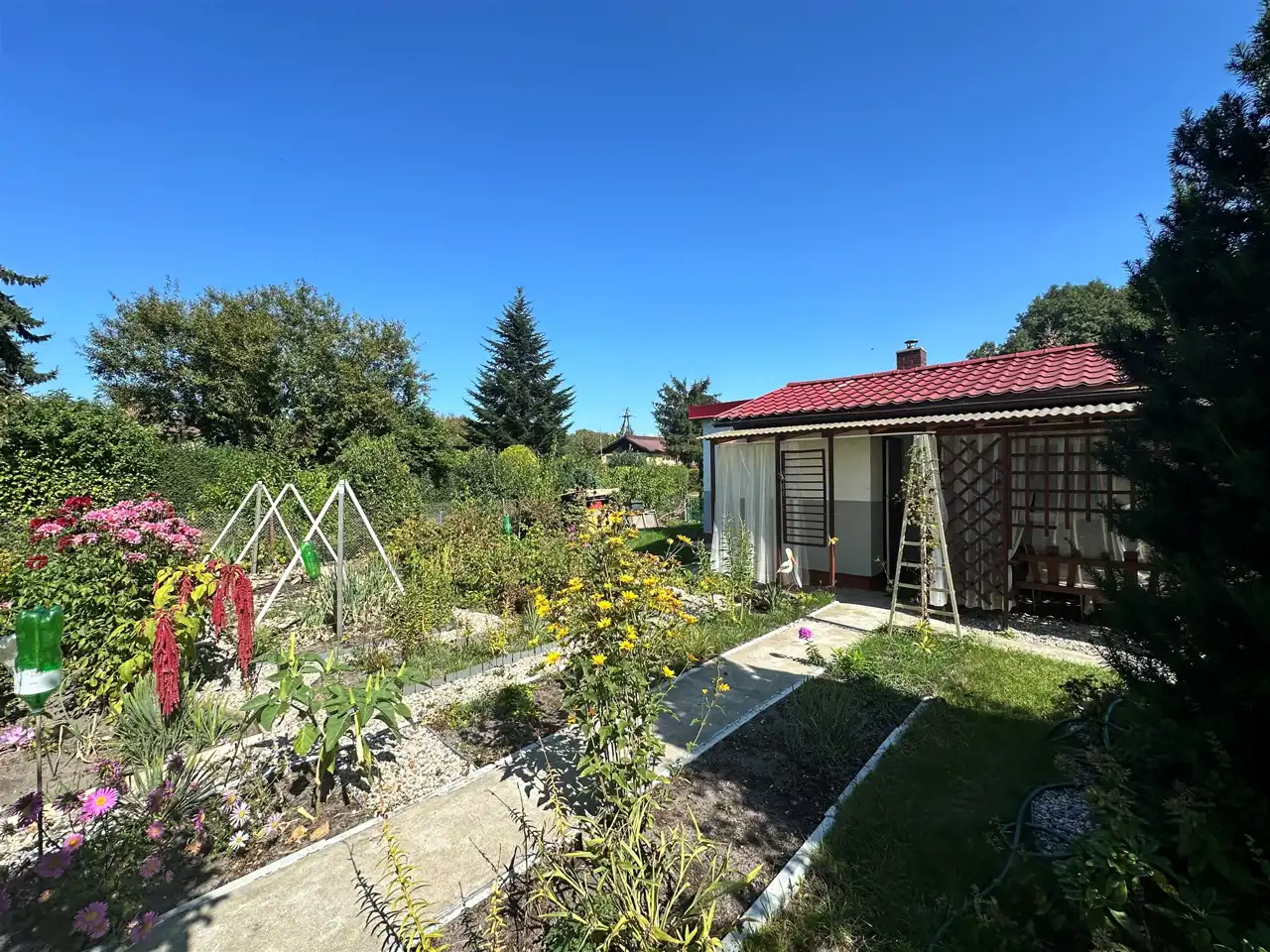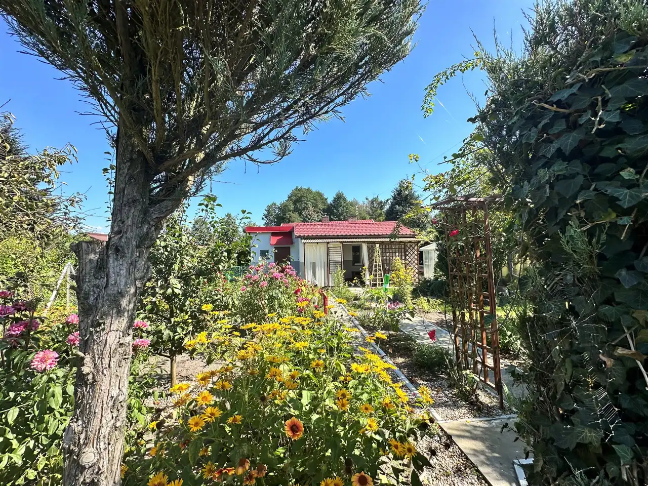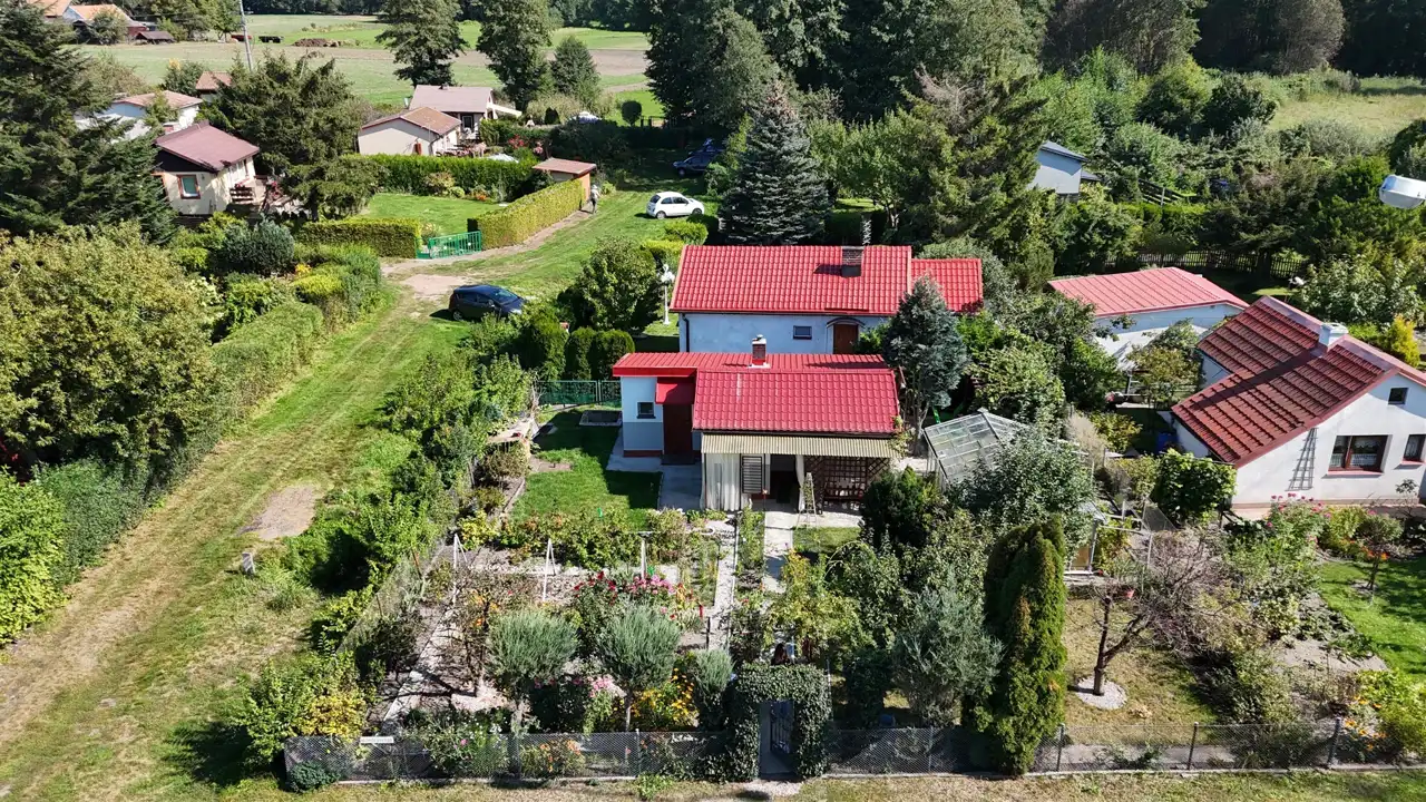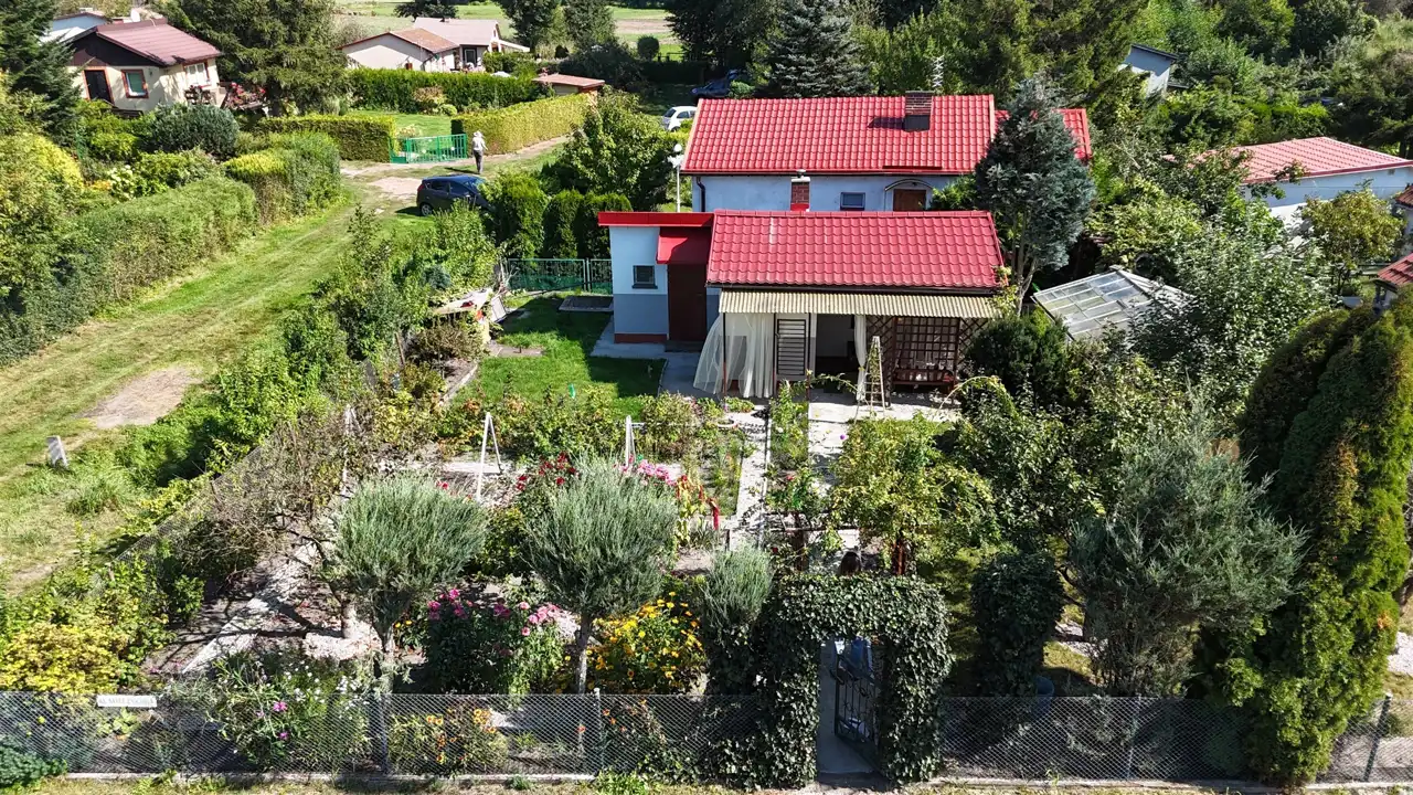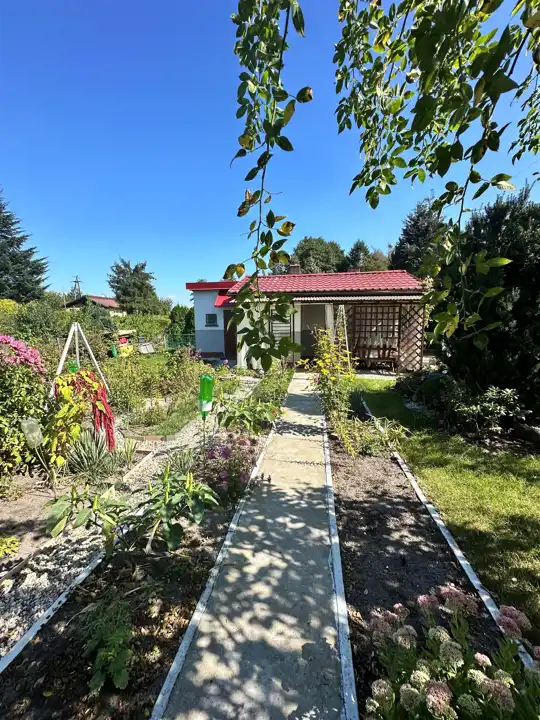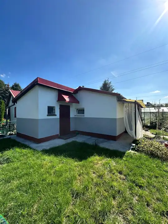 Na działce znajduje się solidny, murowany domek o powierzchni około 35 m², który został ocieplony styropianem, co zapewnia komfort użytkowania zarówno latem, jak i zimą. Dach domku pokryty jest blachodachówką, a okna wykonane są z trwałego plastiku, co gwarantuje niskie koszty utrzymania i długowieczność. Domek posiada również pomieszczenie gospodarcze z WC, które znajduje się w bryle budynku.