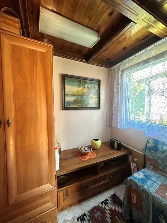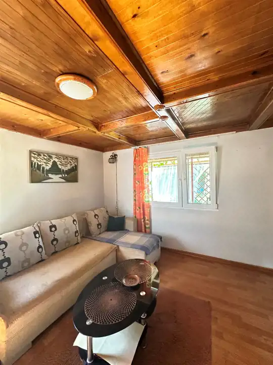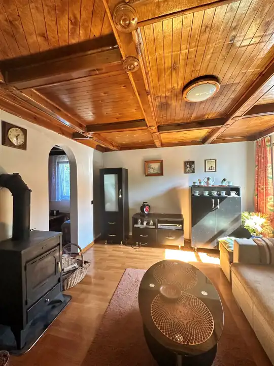 W domku uwagę przyciąga starannie wykonany, ręcznie robiony drewniany sufit, który dodaje wnętrzu wyjątkowego klimatu.