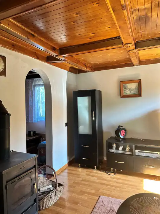Przejście z kuchni prowadzi do przytulnego salonu, który jest sercem domku. Znajduje się tu kominek opalany drewnem, który nadaje wnętrzu ciepły, rustykalny charakter i pozwala cieszyć się przytulną atmosferą nawet w chłodniejsze dni.