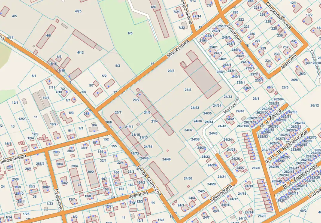 - Numery działek: 20/3, 21/5, 24/53, 24/37, 24/36, 24/35, 24/34, 24/33
